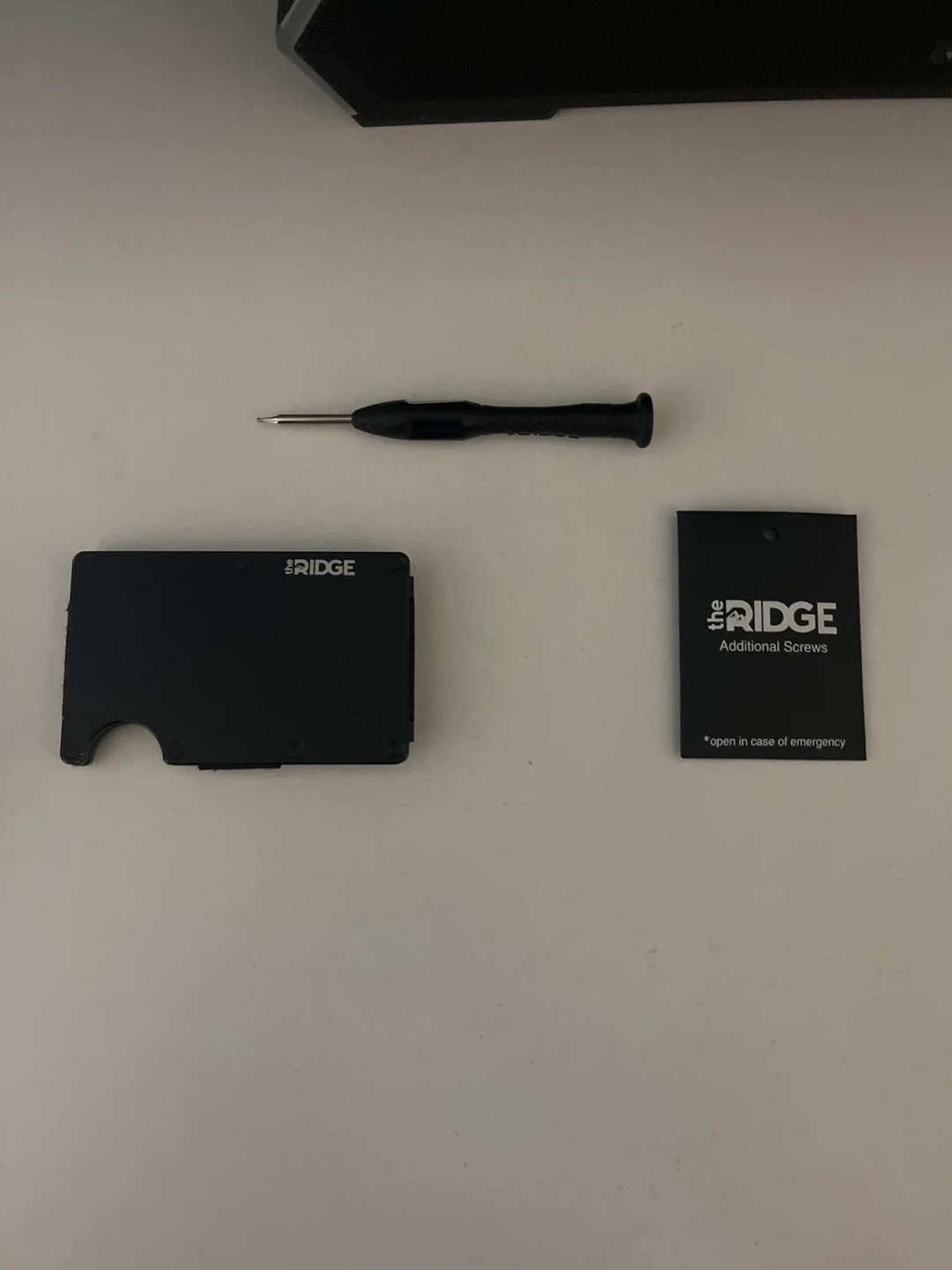 Selling a Ridge Wallet in black. It comes with box, screwdriver, and additional screws. It's in great condition and ready for a new owner!