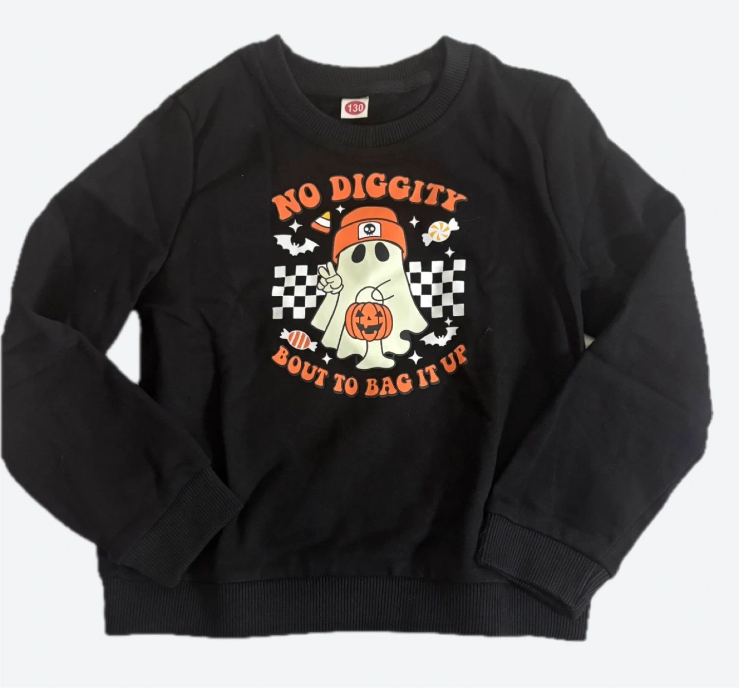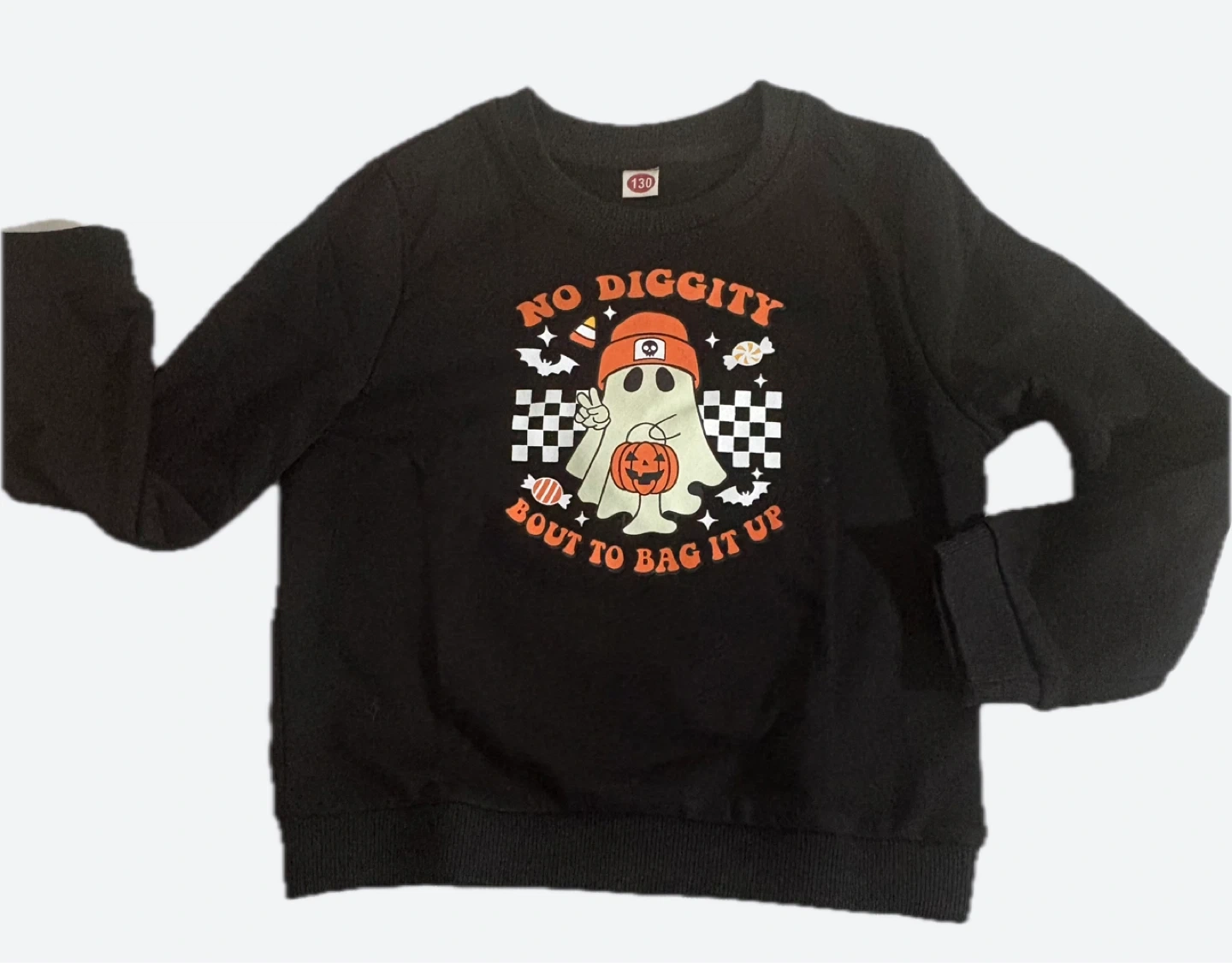Black long-sleeved sweatshirt with a "No Diggity Bout To Bag It Up" Halloween graphic. Features a ghost holding a pumpkin and festive candy designs. Size 130 tag visible.