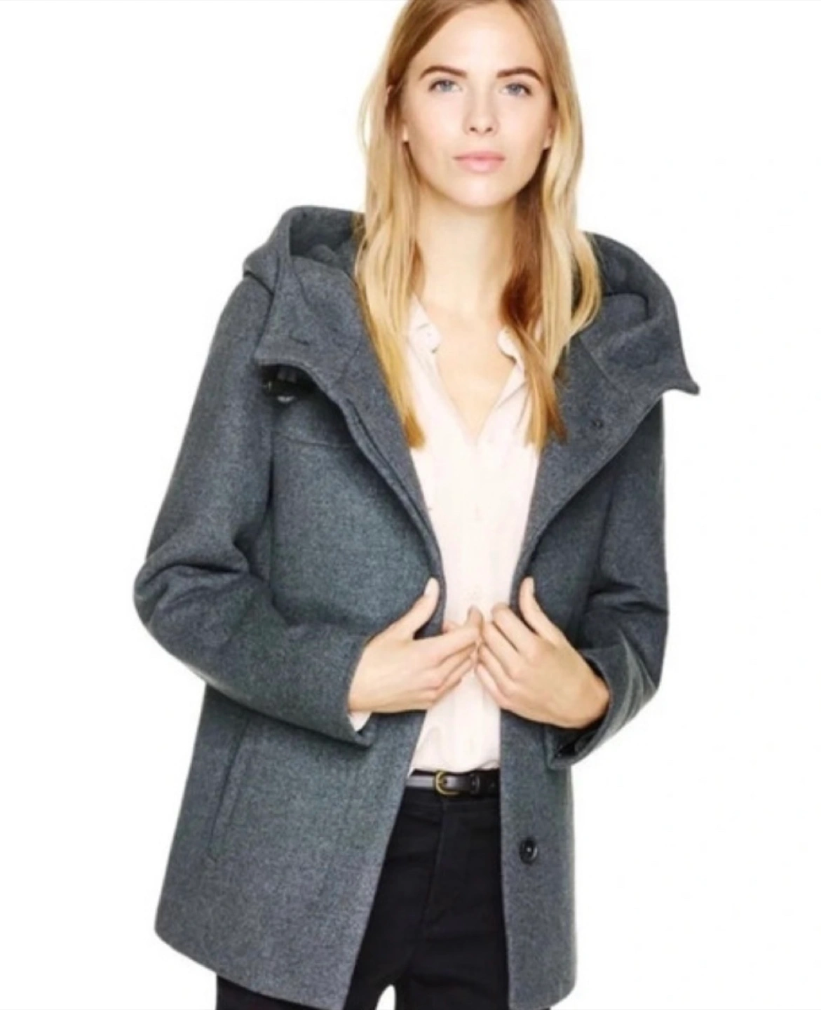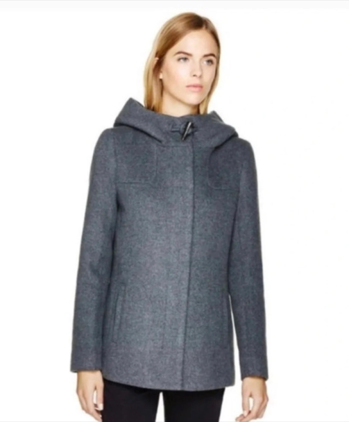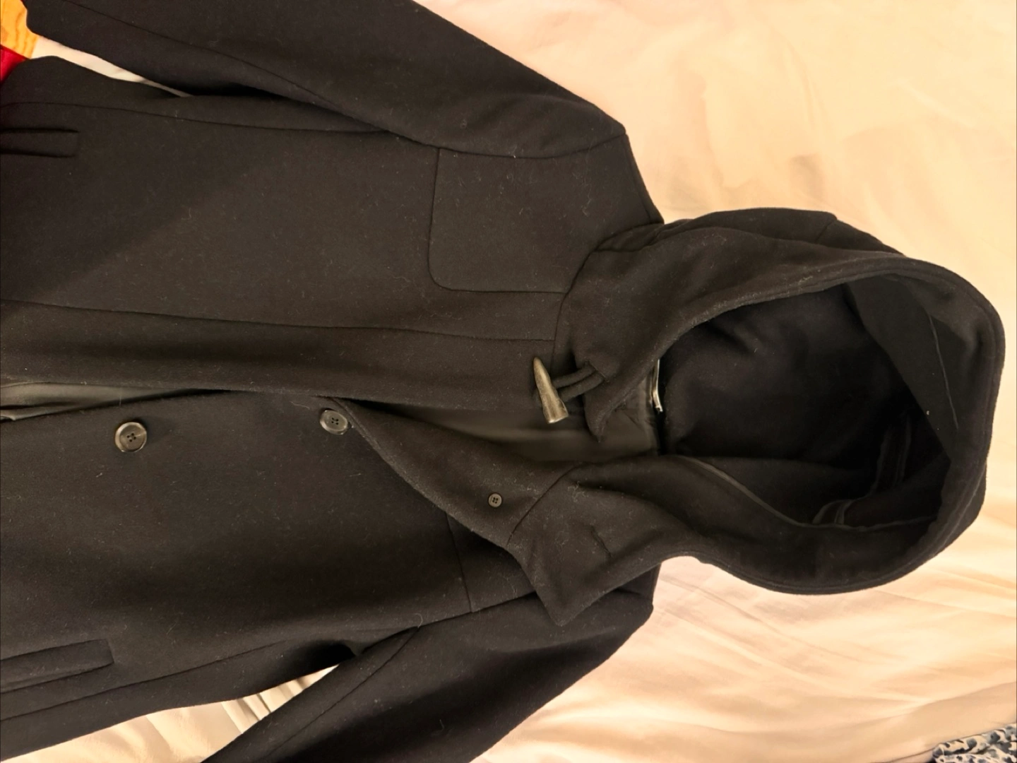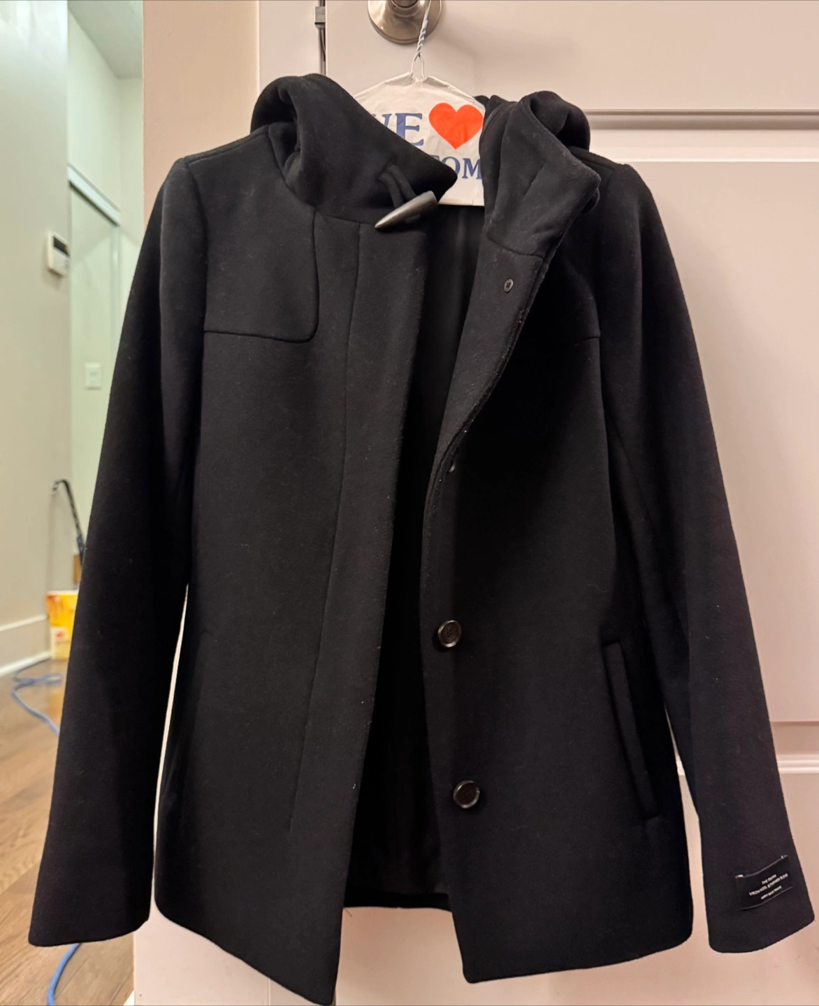 Women's black hooded coat. Size extra small. Features toggle closure and button accents. Excellent condition.