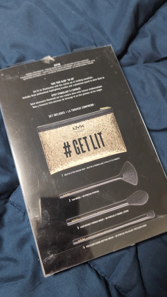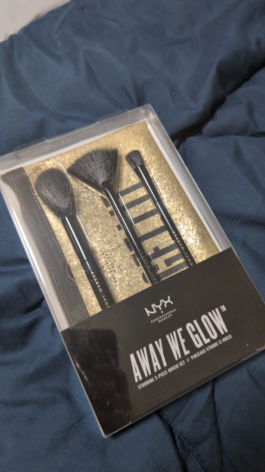 Selling a NYX Professional Makeup Away We Glow strobing 3-piece brush set! The set includes: - A gold glitter makeup bag - A fan brush - A lightweight powder brush - A precision buffing brush
