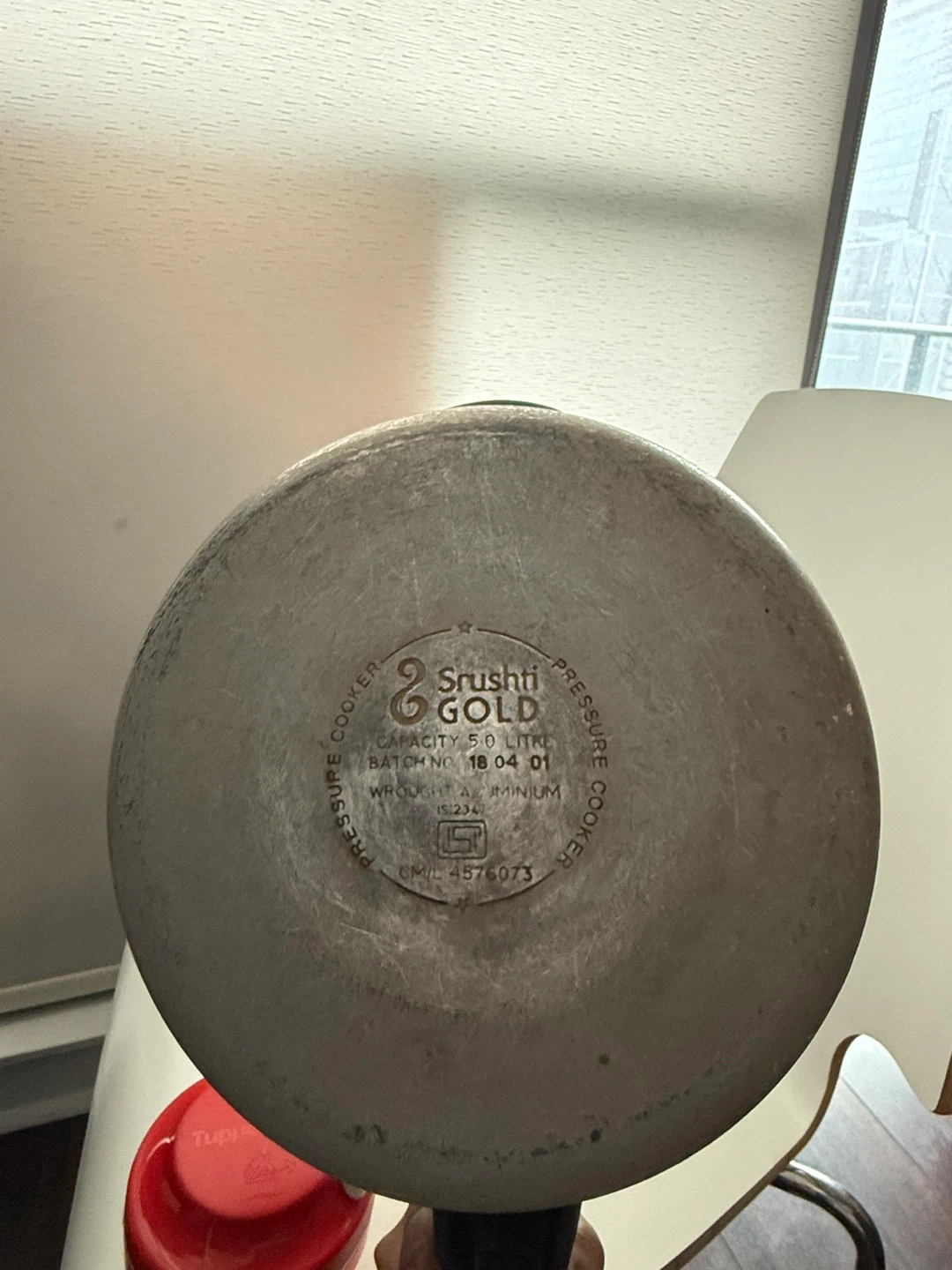 Selling a Srushti Gold pressure cooker with a 5.0 litre capacity. It's made of aluminum.