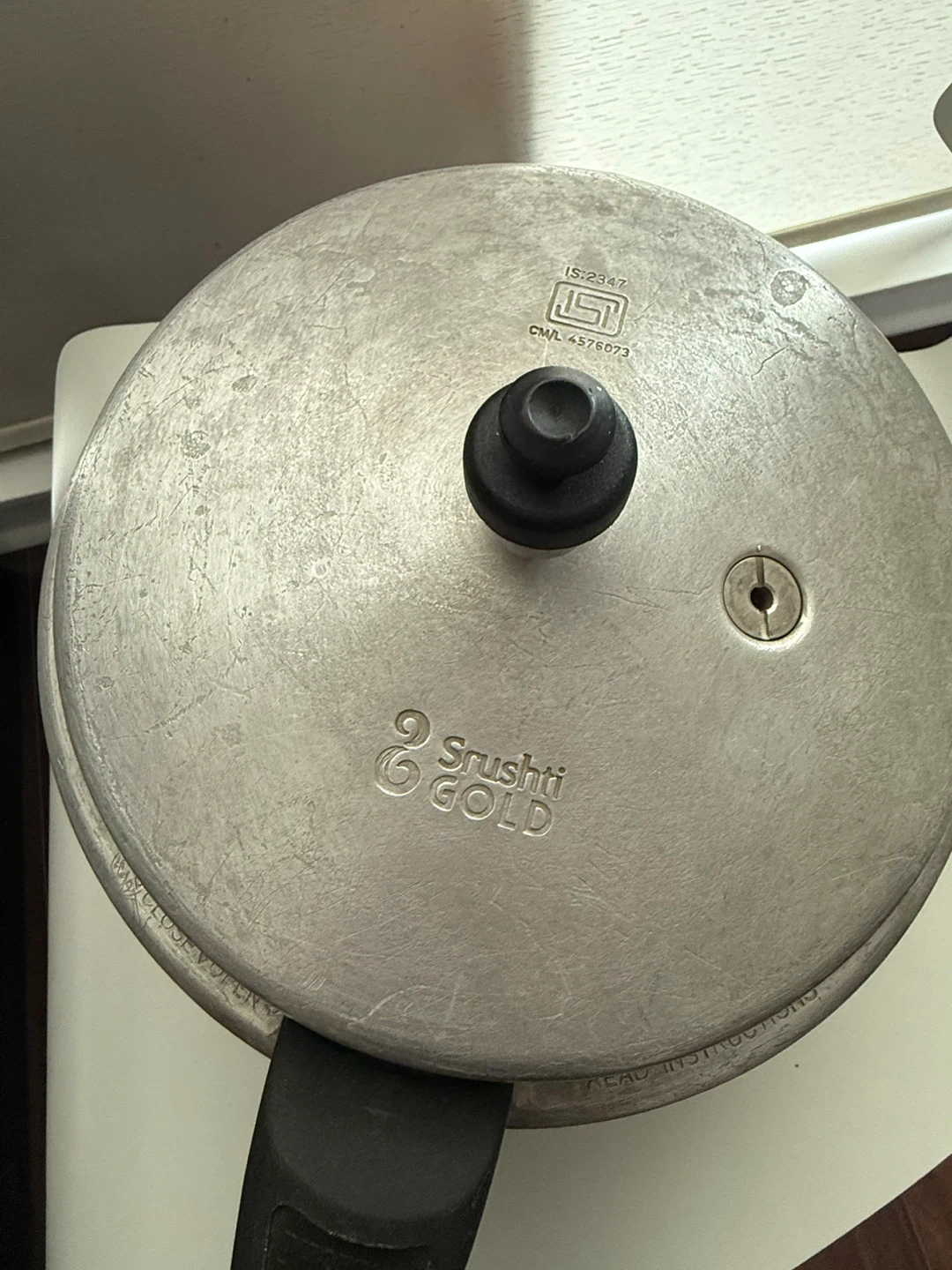 Selling a Srushti Gold pressure cooker with a 5.0 litre capacity. It's made of aluminum.