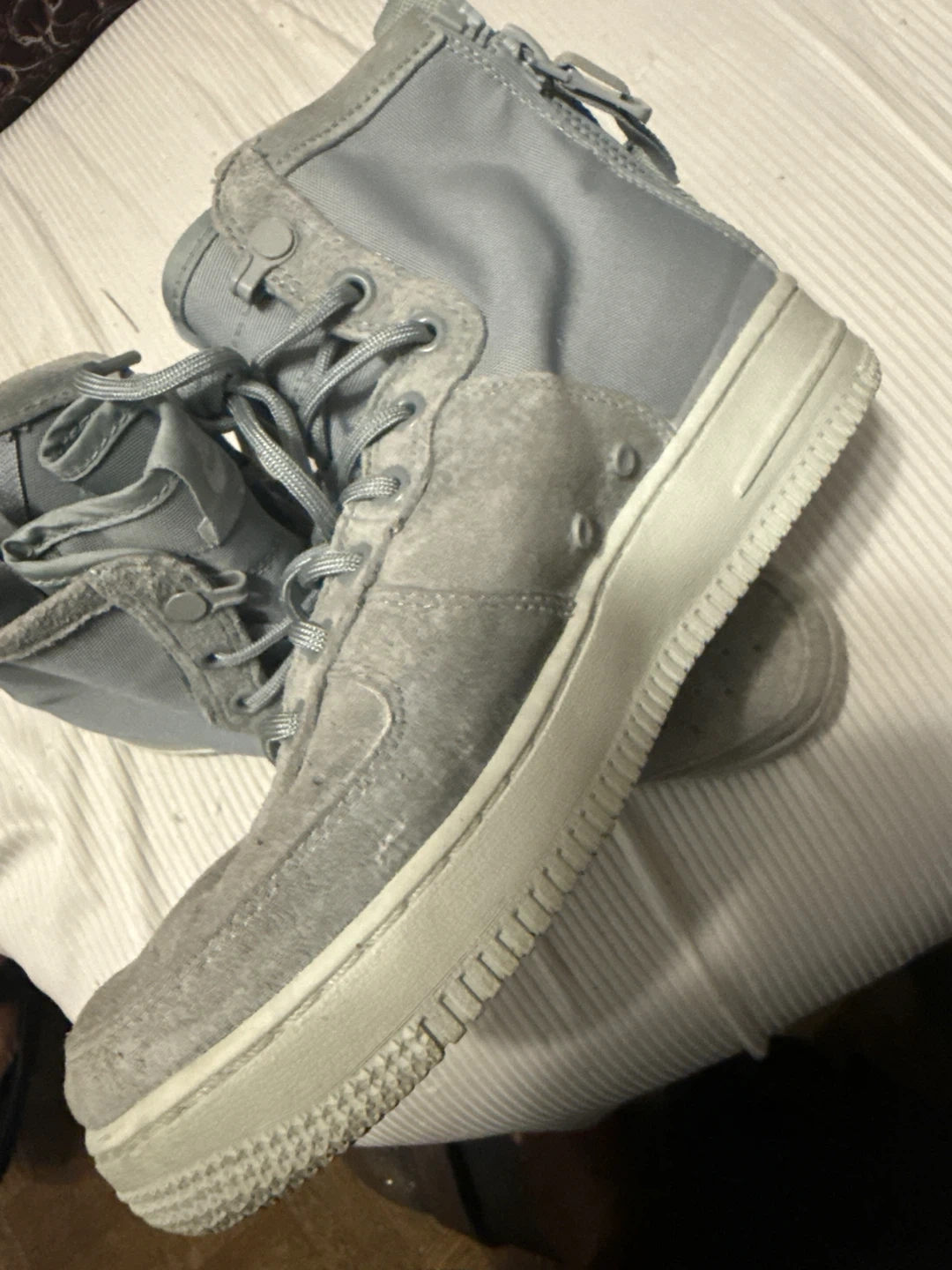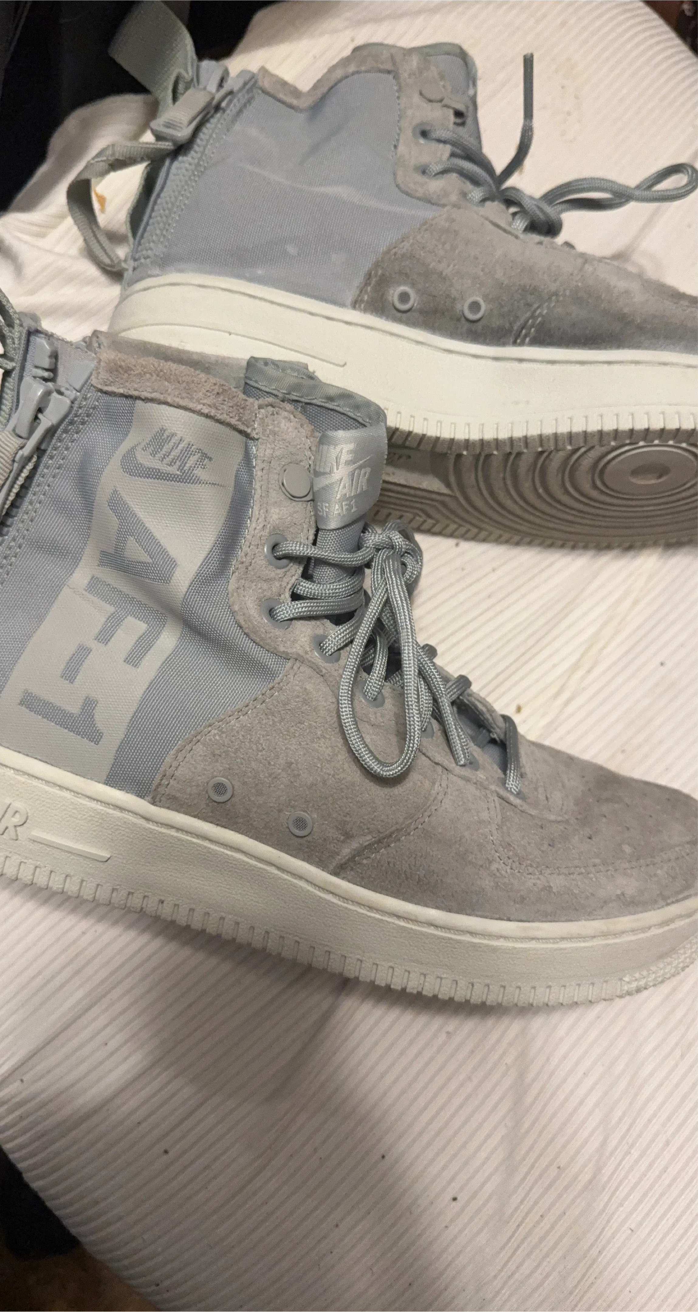 Selling a pair of Nike Air Force 1 High sneakers in grey! They show some signs of wear, but still have lots of life left. These are a stylish and comfortable choice for everyday wear!
