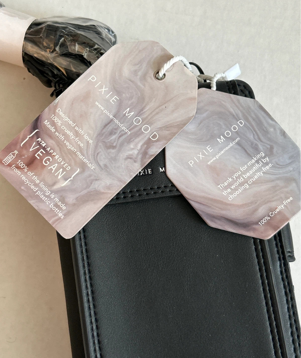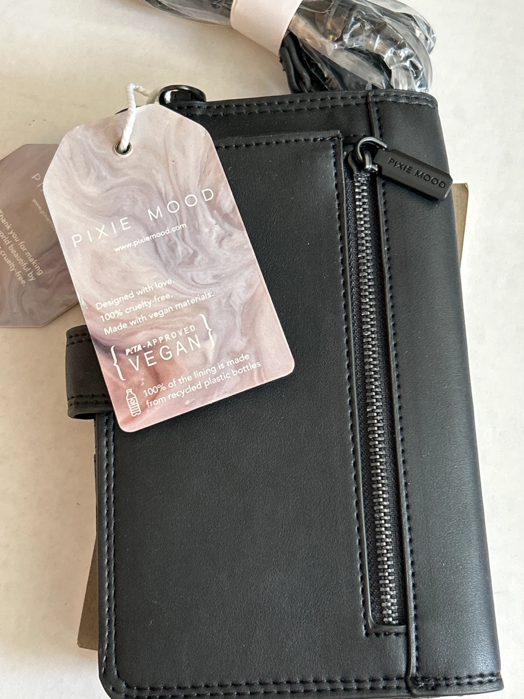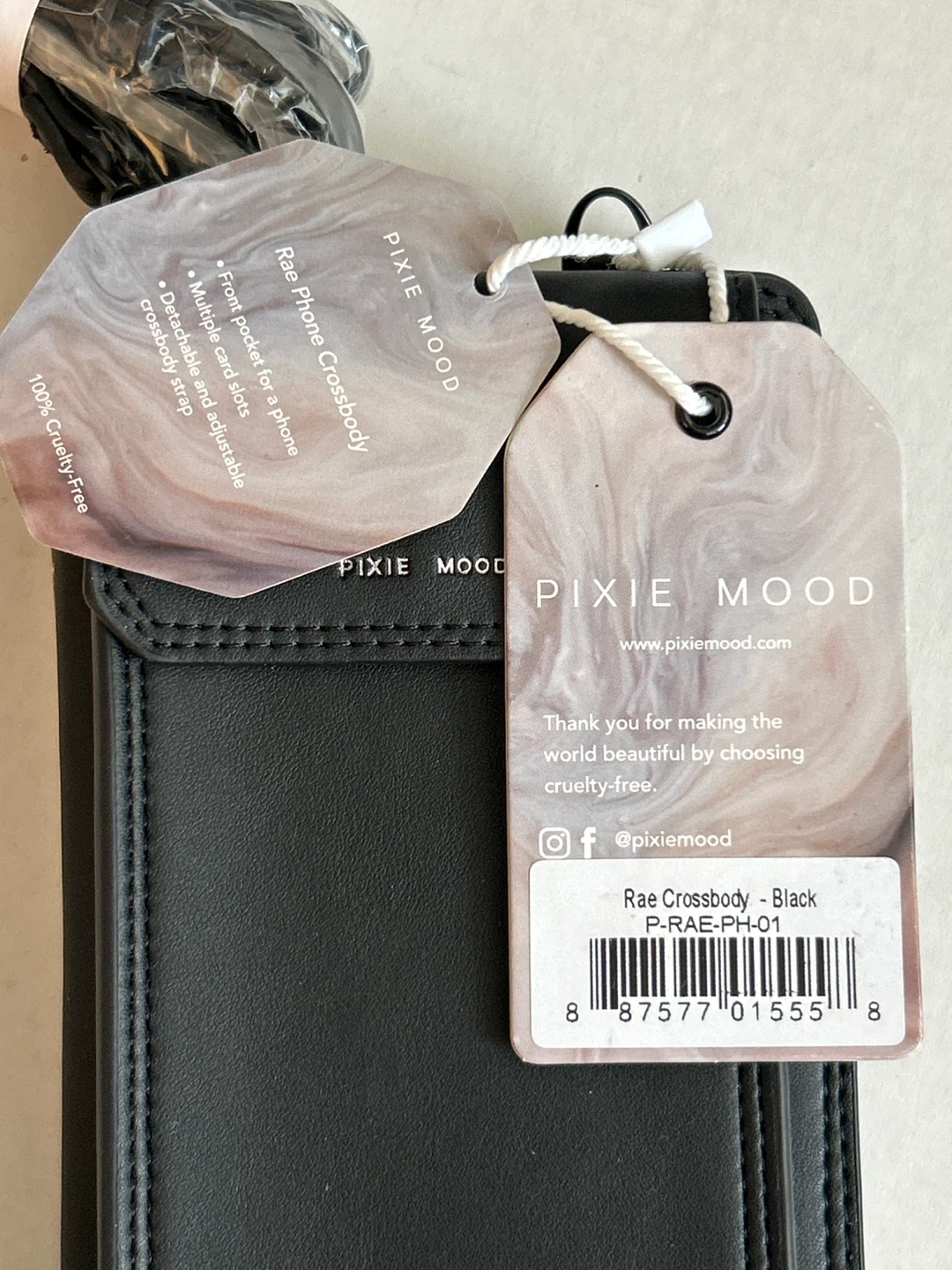 Selling a brand new black Pixie Mood Rae phone crossbody bag. It's made with vegan materials and features multiple card slots and a front pocket for a phone. It includes a detachable and adjustable crossbody strap.