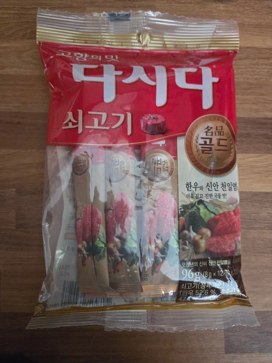 Dasida beef broth powder gold. 96g (8g x 12 sticks). Made with Hanwoo beef and Shinan sun-dried salt for a deep, rich broth flavour!