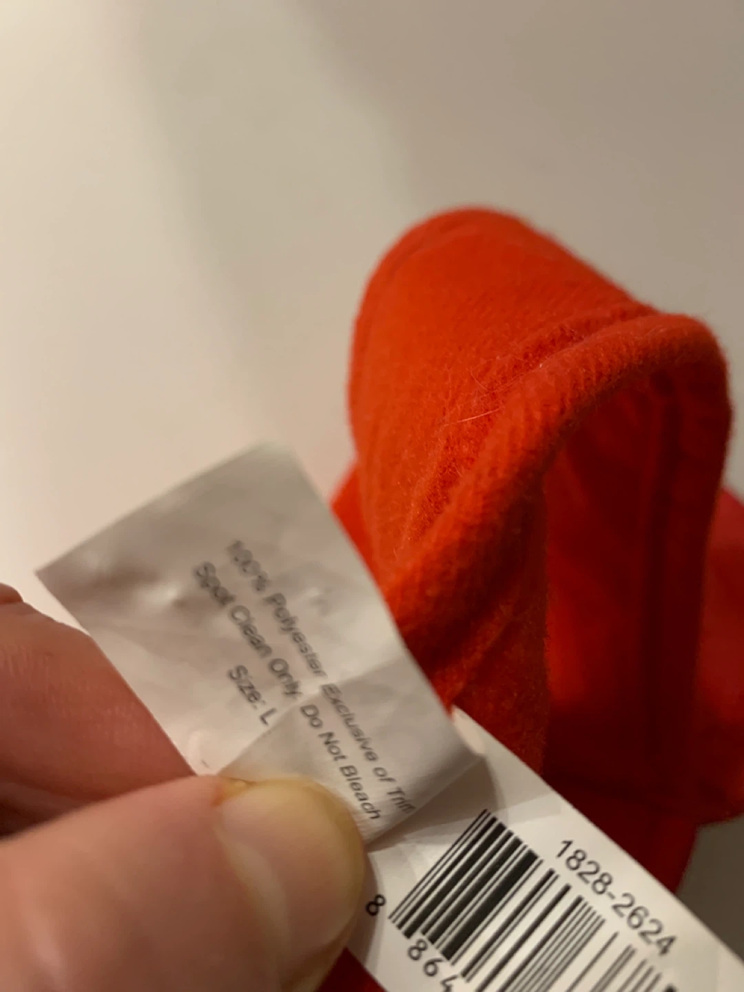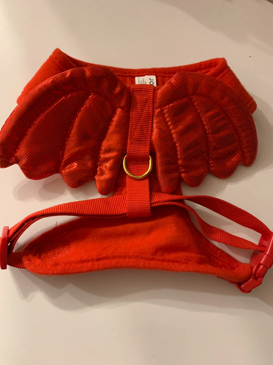 Bright red pet costume harness with attached wings. Made from 100% polyester material. Spot clean only. Size is large.