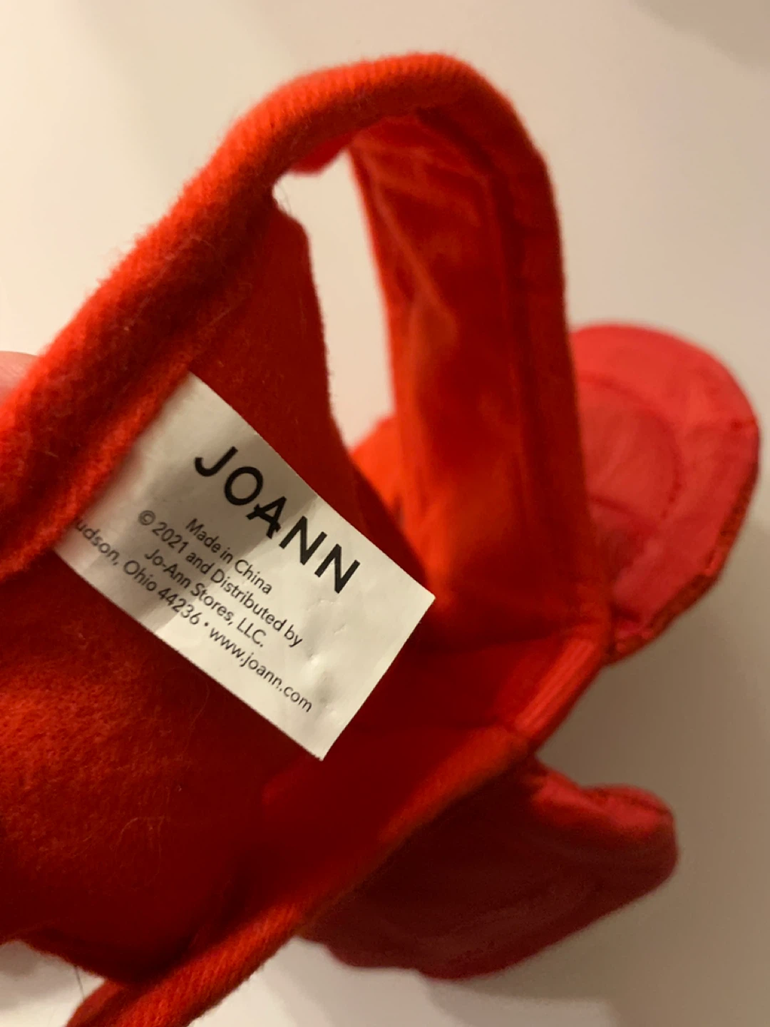 Bright red pet costume harness with attached wings. Made from 100% polyester material. Spot clean only. Size is large.