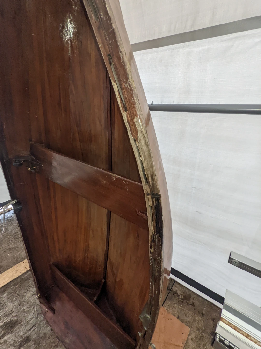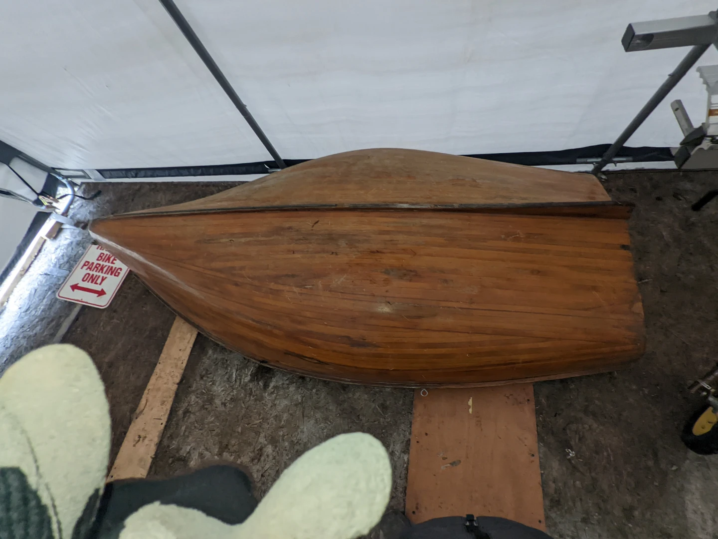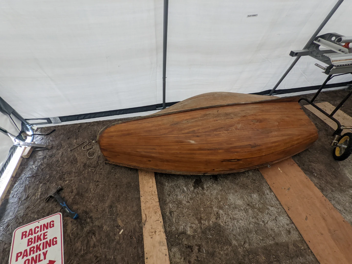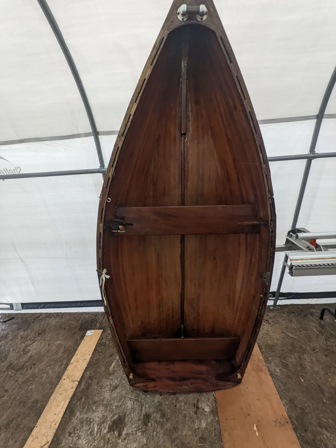 Vintage wooden rowboat. Constructed from wood with brass fittings. Appears to be a classic design, ready for restoration or display.needs minor repair on right edge no leaks could use refinishing