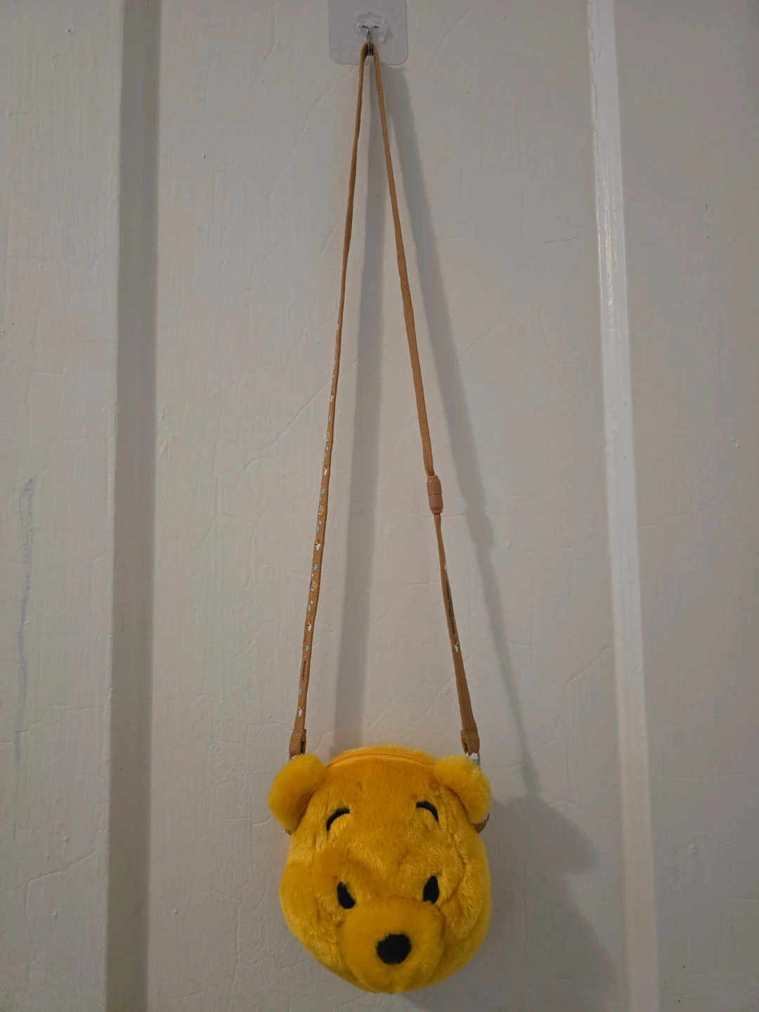 This Cute fuzzy Winnie the Pooh crossbody bag. It features a clear ID window on the back and a honey pot design. Perfect for kids or any Pooh fan!