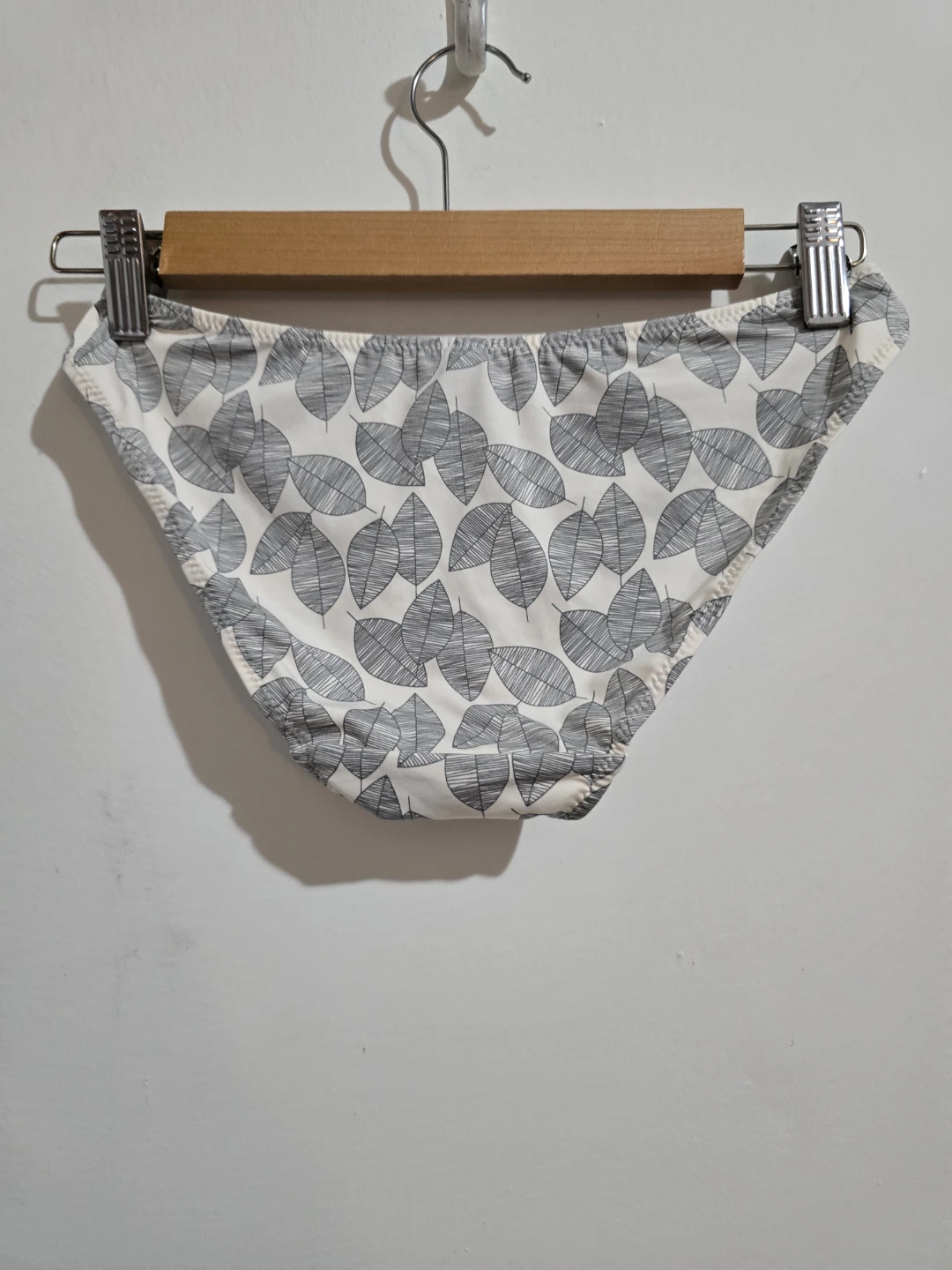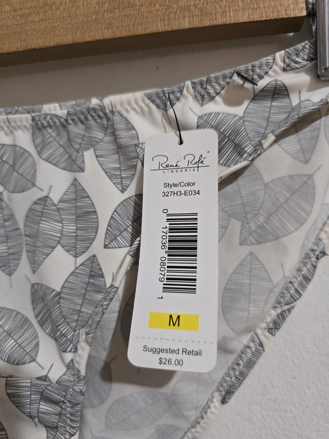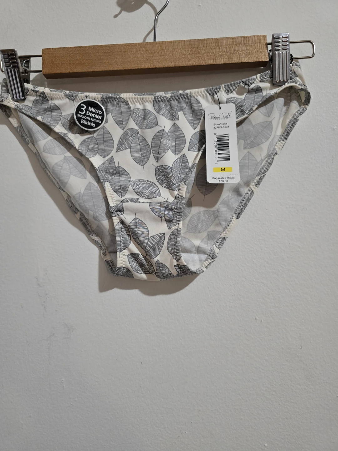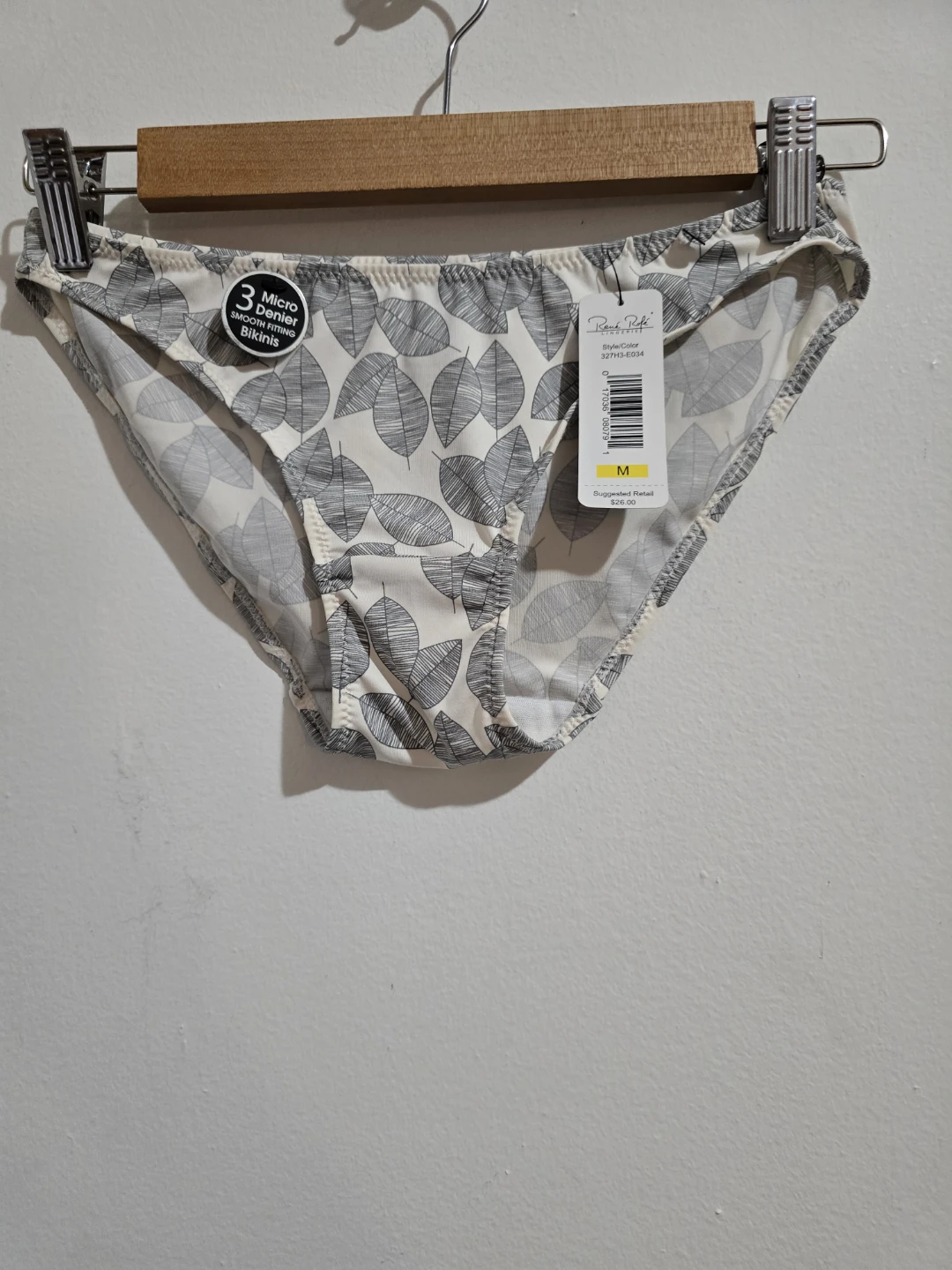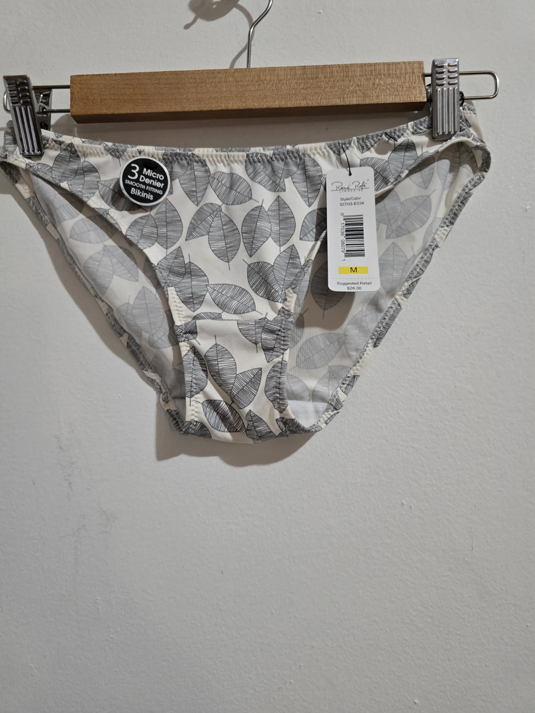 These René Rofé bikini briefs feature a stylish leaf print. They're made from 3 Micro Denier material for a smooth feel. Size M. Suggested retail $26.00.