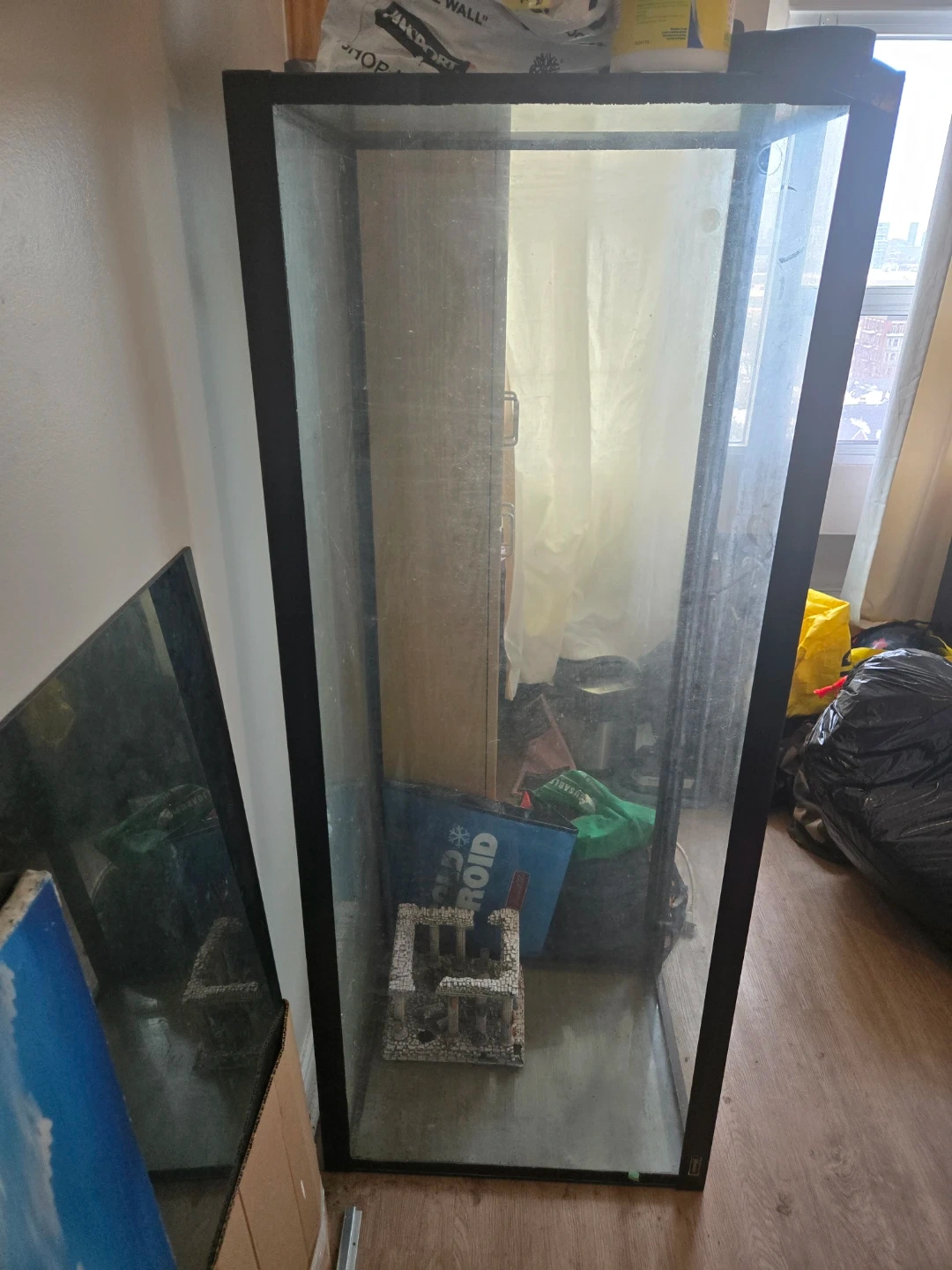 This is a large 120 g glass aquarium tank. It's made of glass with black trim. Comes with a decorative castle and they have more little items i don't have the space anymore ... that's all