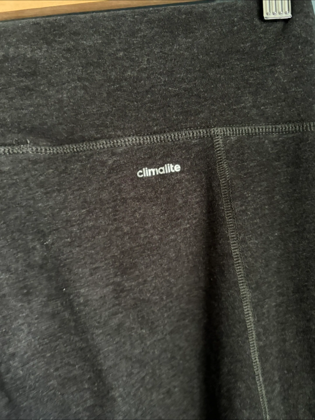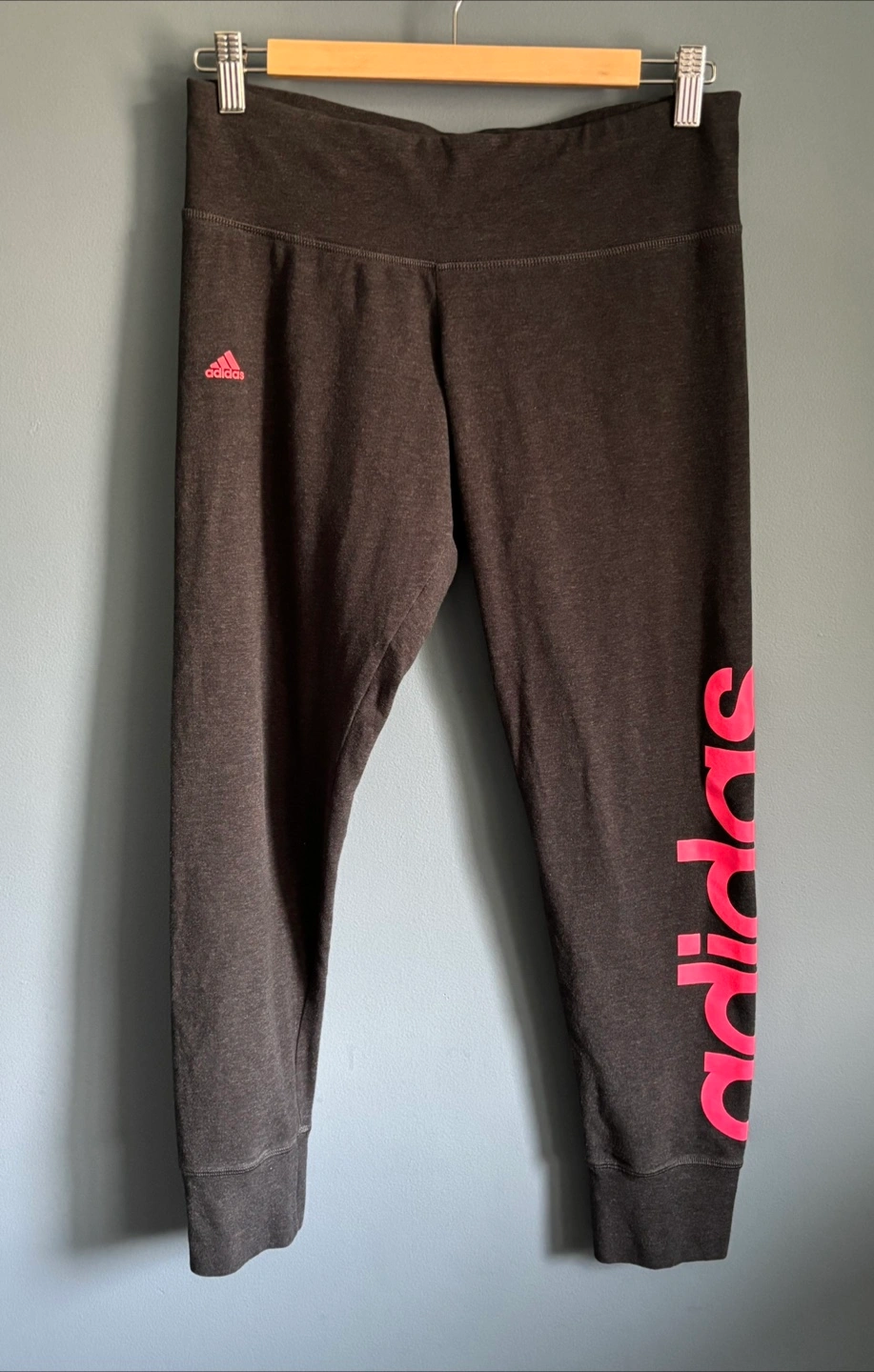 Adidas Sport Essentials leggings in size medium. They're a dark grey colour with pink Adidas logo on the leg. Made with Climalite fabric, so they're great for working out! Or under snow pants!