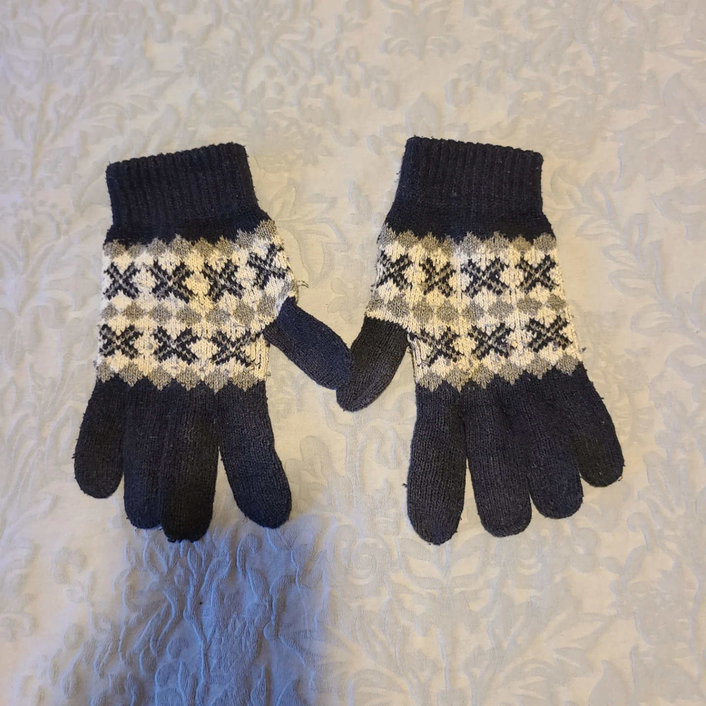 A pair of knit gloves featuring a classic navy blue and cream Fair Isle pattern. The cuffs are ribbed for a snug fit. These gloves are great for keeping your hands warm on chilly days!