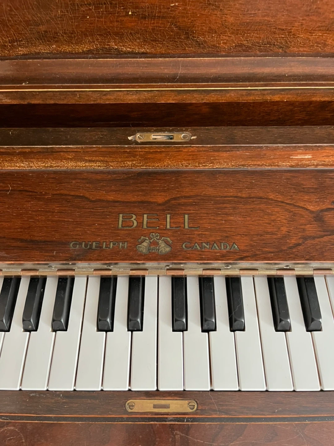 Must pick up. Open to offers! A classic Bell upright piano, made in Guelph, Canada. This wooden piano has 88 keys. It's a beautiful piece for any home! Keys have been updated. Listing for family.