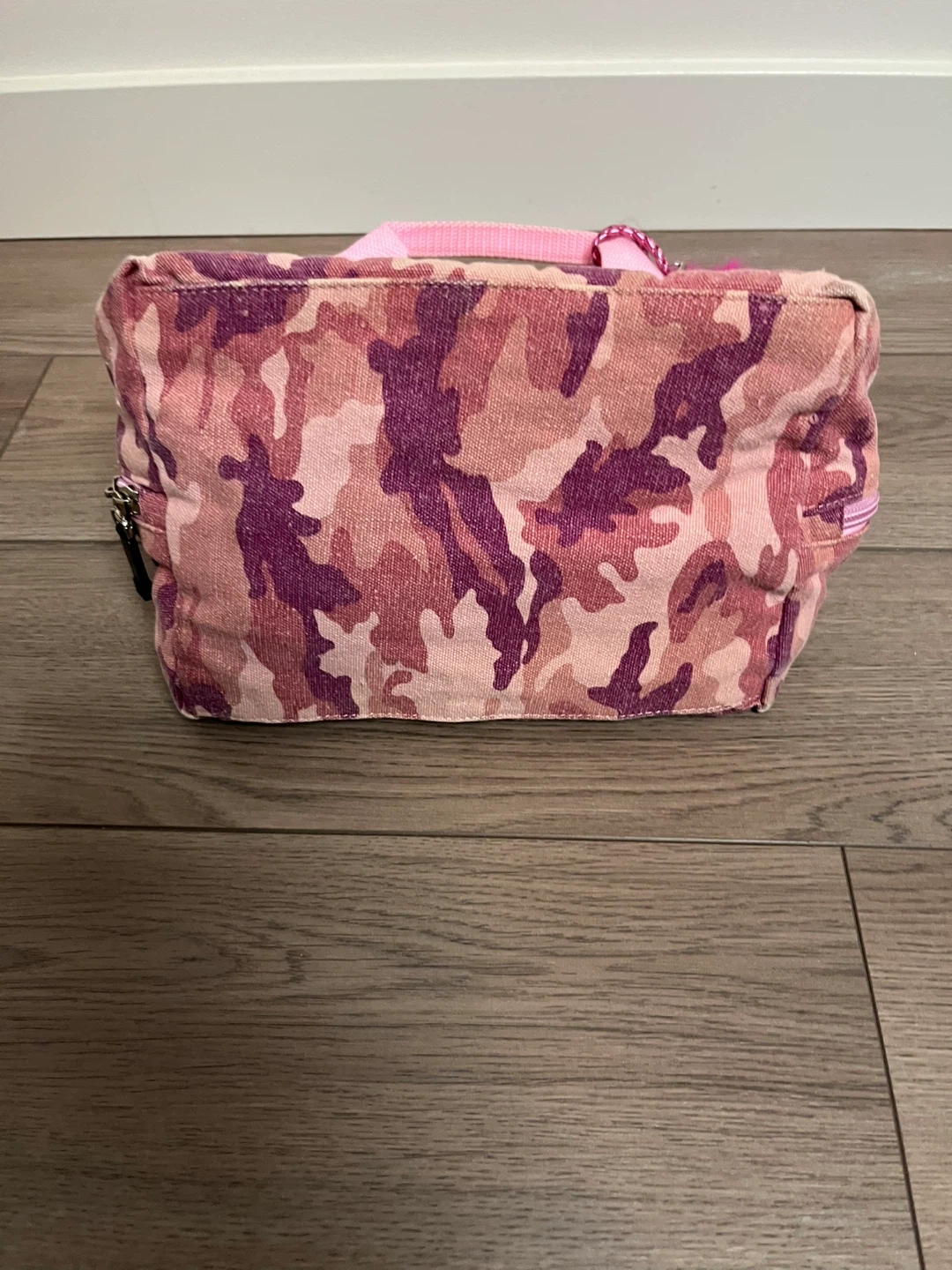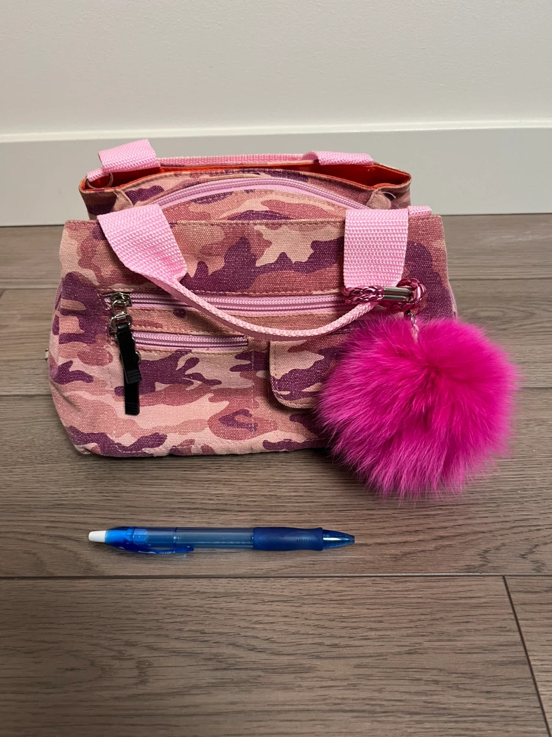 Selling a cute handbag from XX by Mexx! It features a fun pink and purple camo print on the outside and a bright orange interior. It has multiple compartments to keep your things organized and a fun fluffy pink pompom charm.