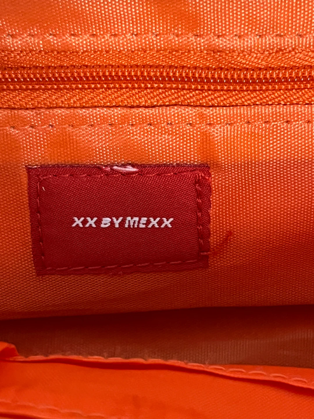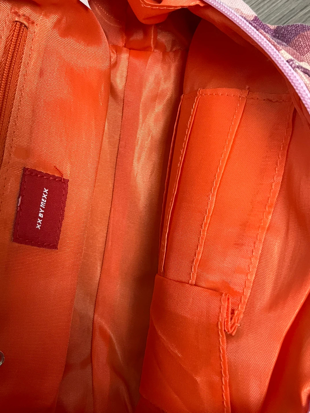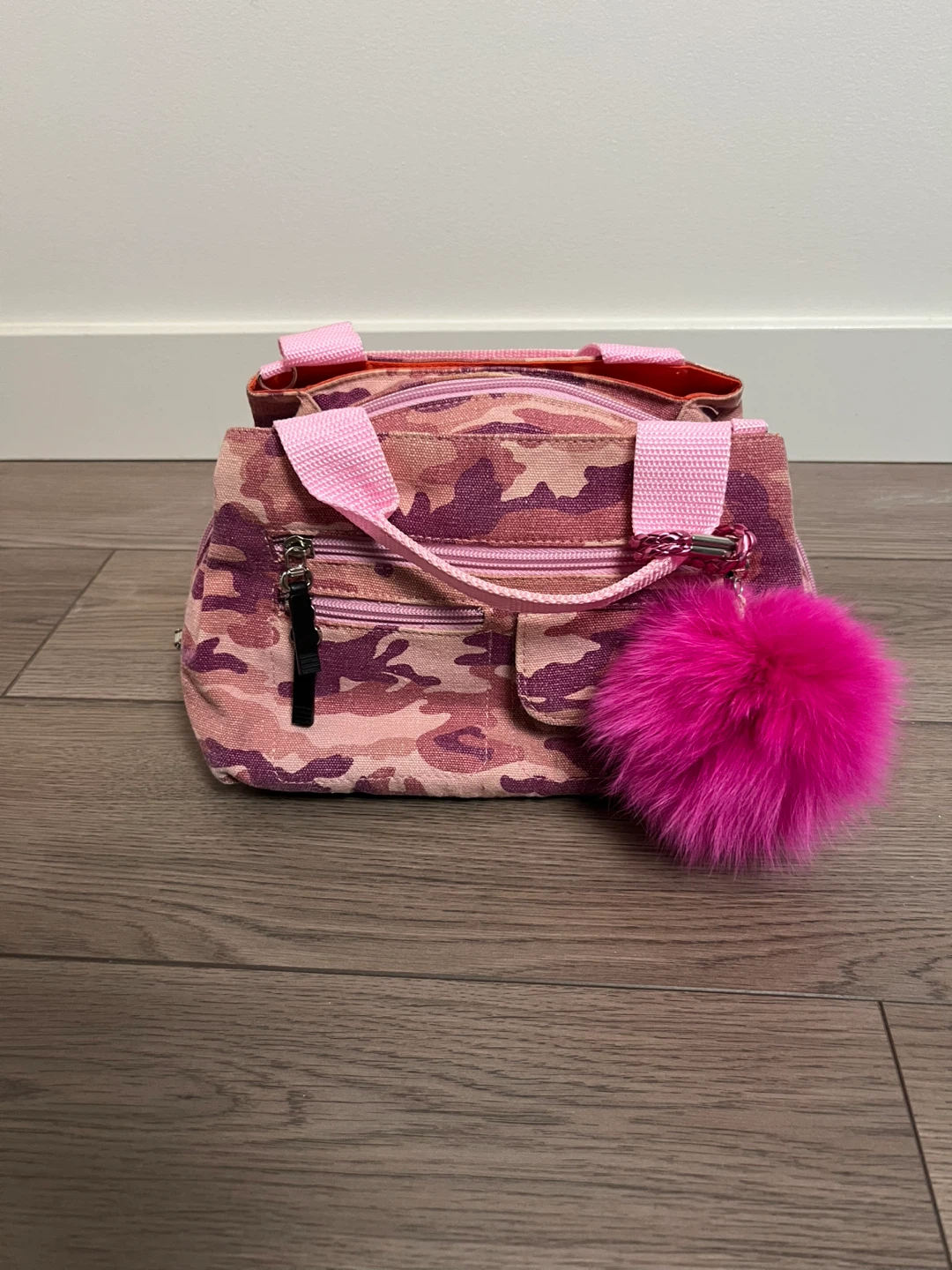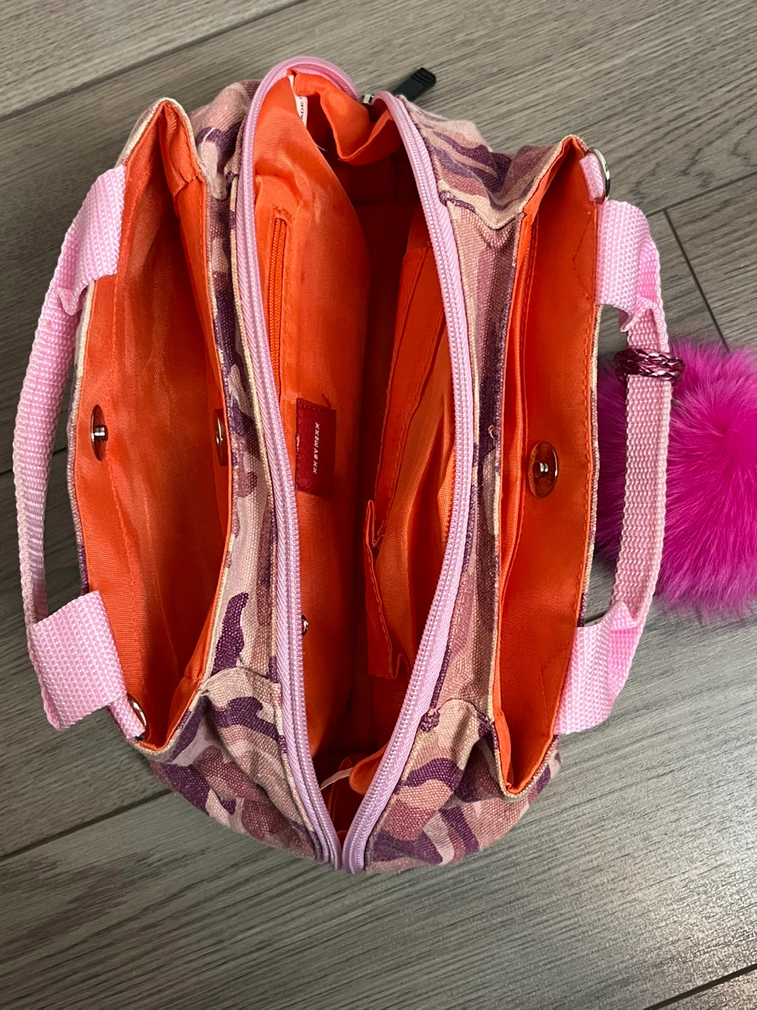 Selling a cute handbag from XX by Mexx! It features a fun pink and purple camo print on the outside and a bright orange interior. It has multiple compartments to keep your things organized and a fun fluffy pink pompom charm.