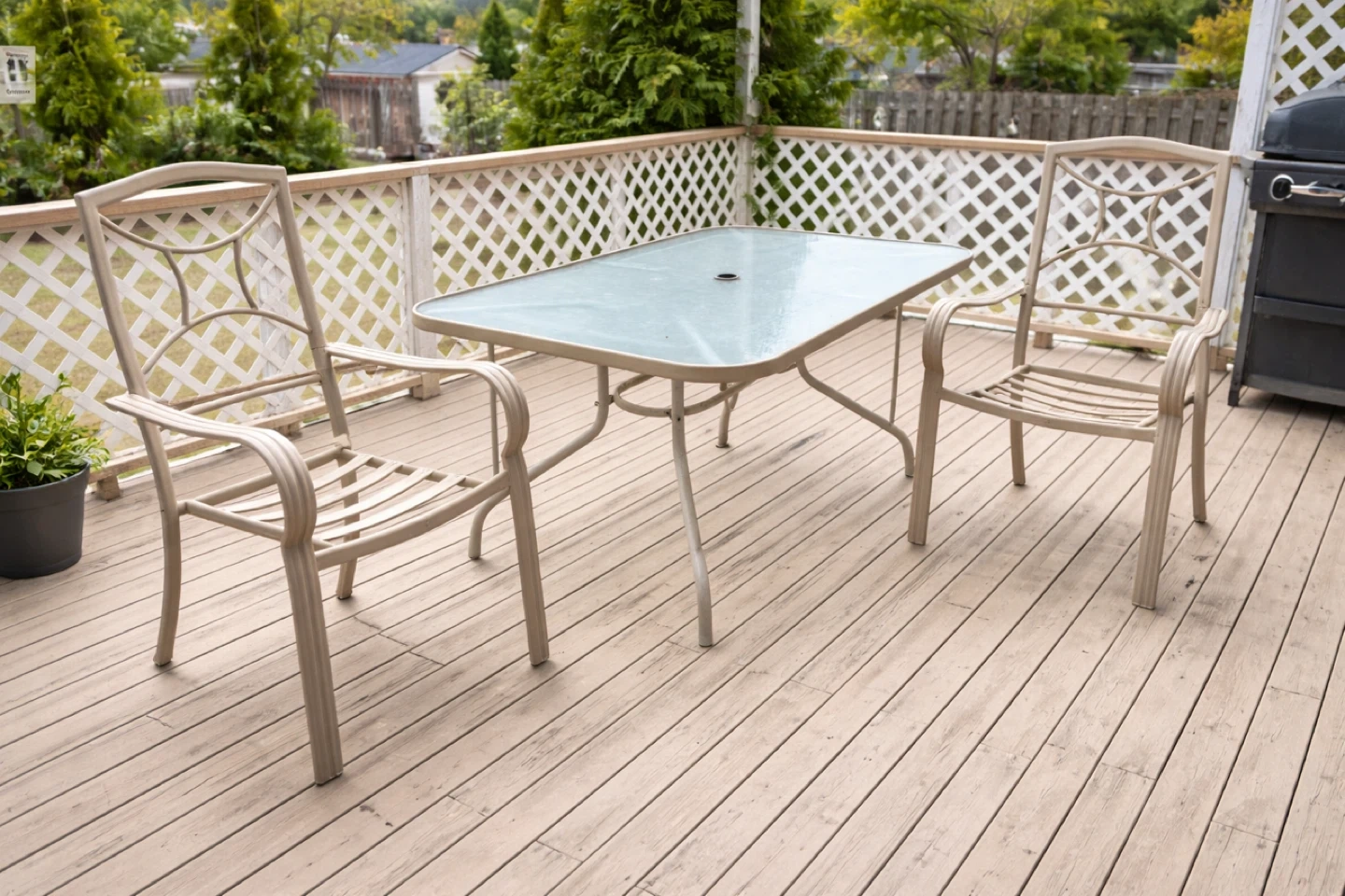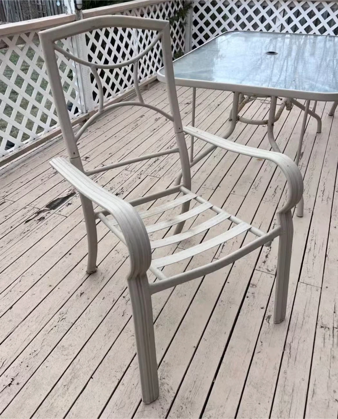 Outdoor dining set with a rectangular glass-top table and two matching chairs. Table has a metal frame with a glass surface. Chairs are also metal with a slat-style seat and back. Great for your deck or patio!