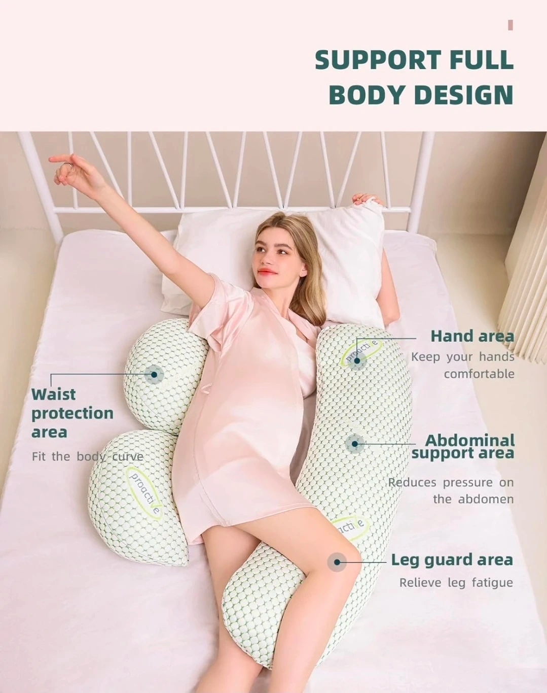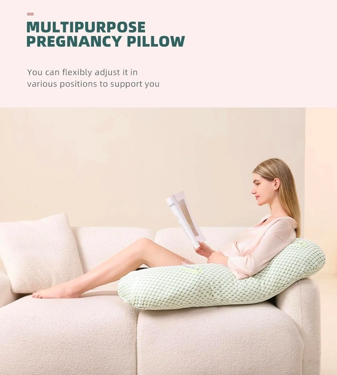 This multi-functional combination pillow offers full body support. It's designed to relieve pressure and pain in different areas, supporting the abdomen, waist, and legs. The pillow can be adjusted into H, L, and U shapes for early, mid, and late pregnancy stages.