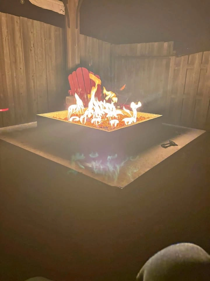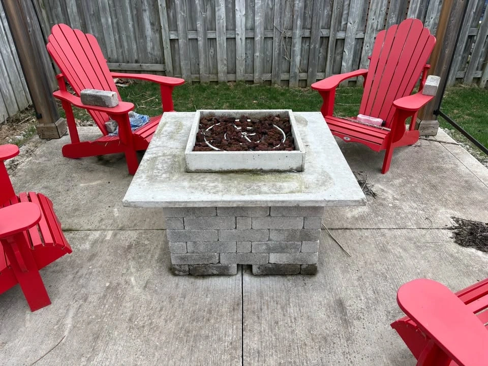 Stone and concrete fire pit. Overall good shape, could use a cleaning. Top base comes off, over all size 41”x41”. Comes with two propane tanks. This is very heavy. I can dolly it to your car and help lift.