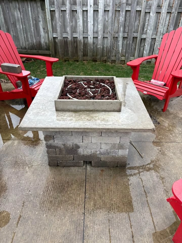 Stone and concrete fire pit. Overall good shape, could use a cleaning. Top base comes off, over all size 41”x41”. Comes with two propane tanks. This is very heavy. I can dolly it to your car and help lift.