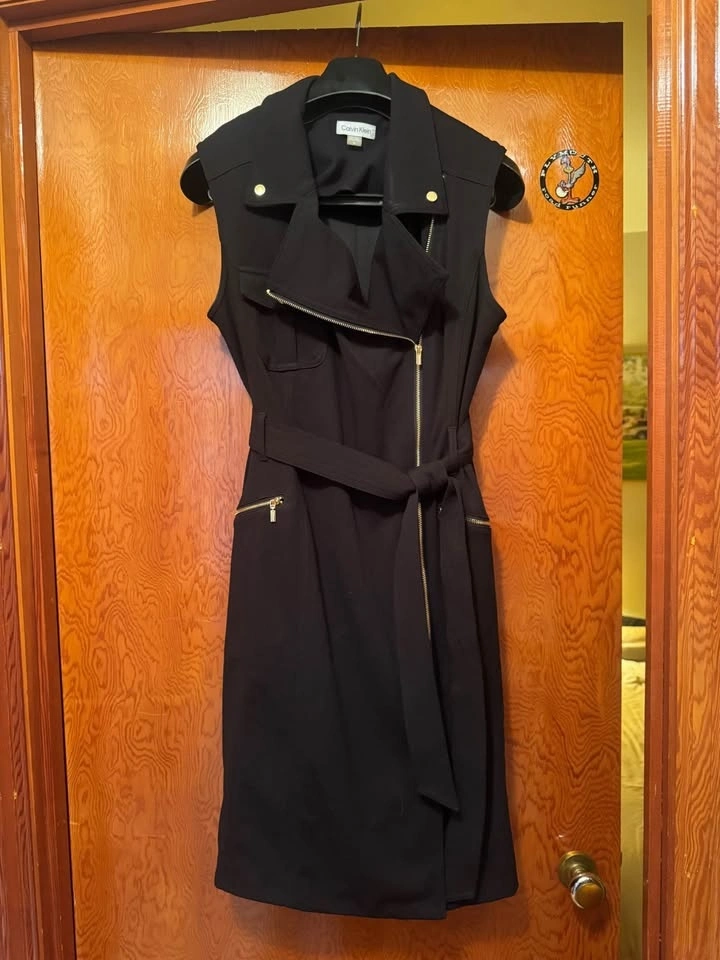 Chic sleeveless trench-style dress from Calvin Klein with gold zippers, waist tie, and a flattering structured fit. Brand new with tags, never worn. Perfect for work, date nights, or layering for fall. From a smoke-free home. Asking $120 OBO. Pickup in Windsor.