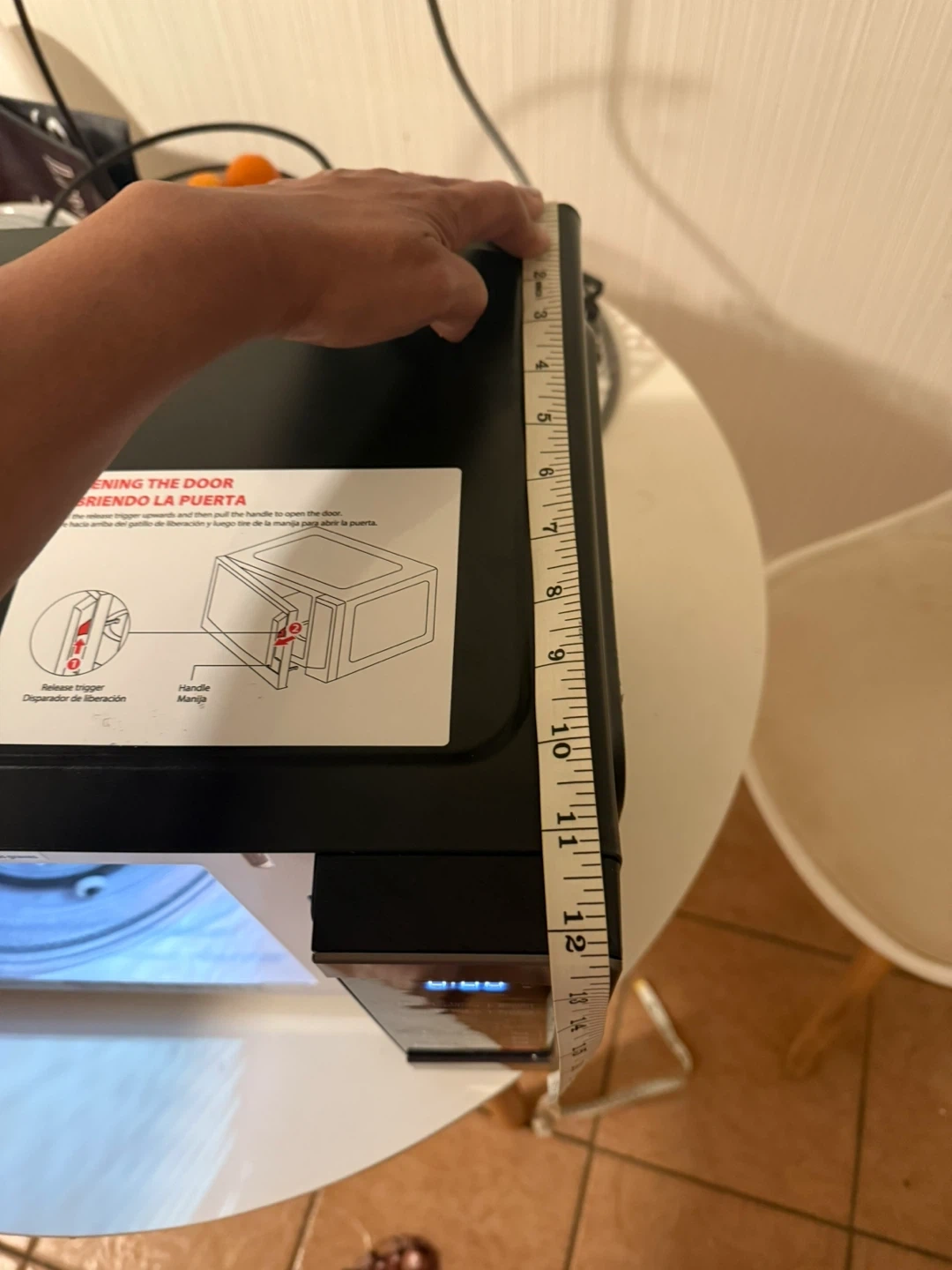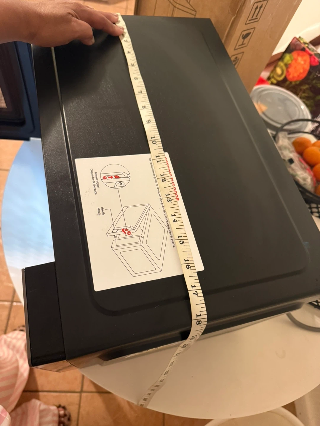It has several preset options for cooking popcorn, potatoes, pizza, and more. The dimensions are approximately 18 inches wide and 11 inches tall.