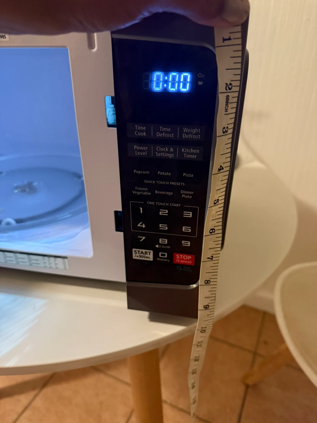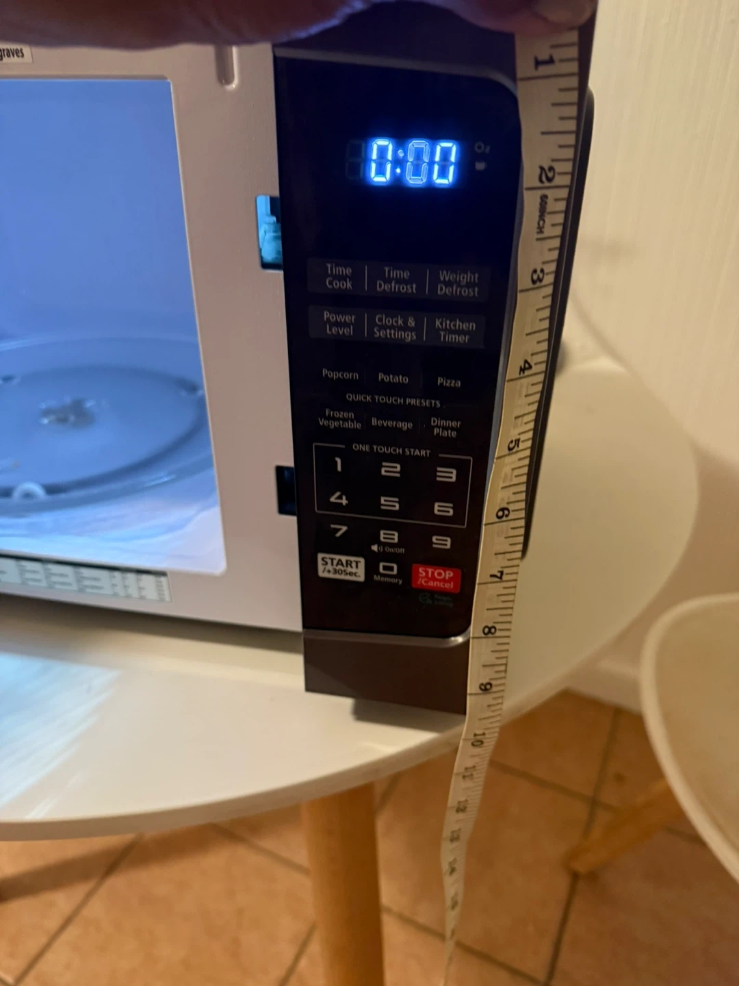It has several preset options for cooking popcorn, potatoes, pizza, and more. The dimensions are approximately 18 inches wide and 11 inches tall.