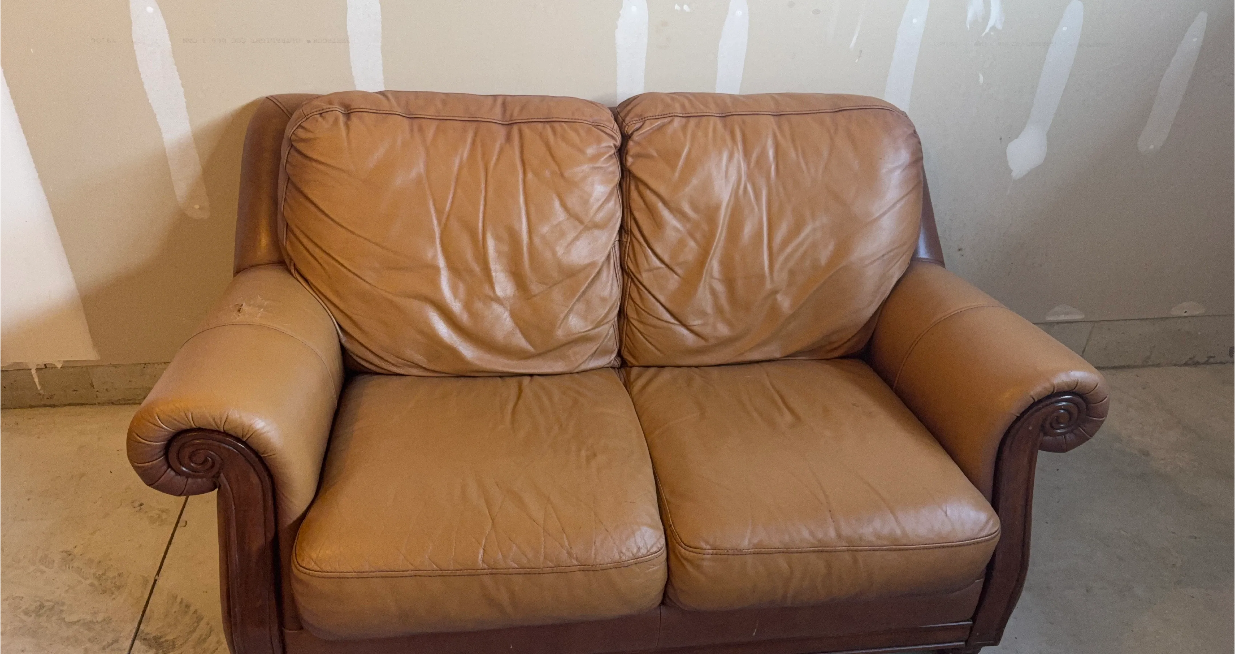 A classic tan leather loveseat. It features plush cushions and rolled arms. Some wear on the left armrest, but overall good condition. This two-seater sofa is comfy for any living space.