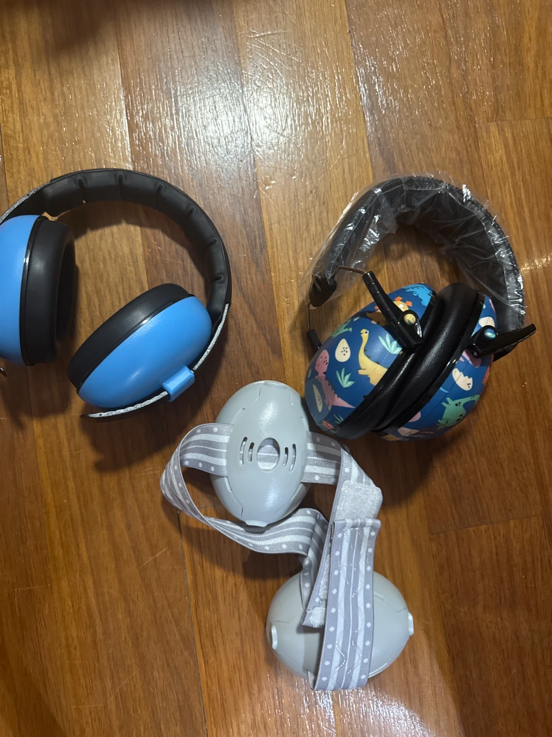 Selling two pairs of baby earmuffs to protect your little one's ears! One is a solid blue color, and the other has a fun dinosaur print. Great for concerts, sporting events, or just noisy environments