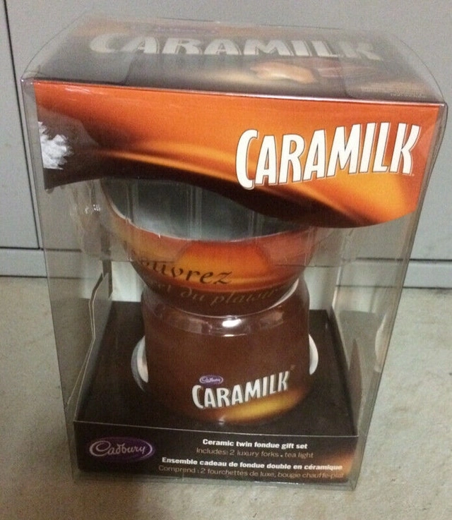 Cadbury Caramilk fondue set for sale. New in box. Includes two forks. Fun for melting chocolate or cheese with family and friends, keeping dip warm at a party, and more. $8. Near the Burlington/Oakville border.