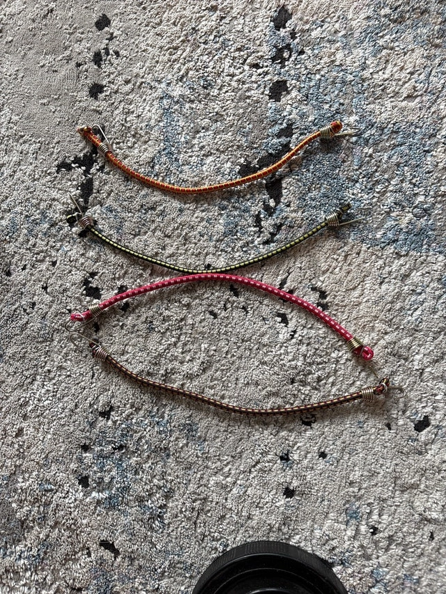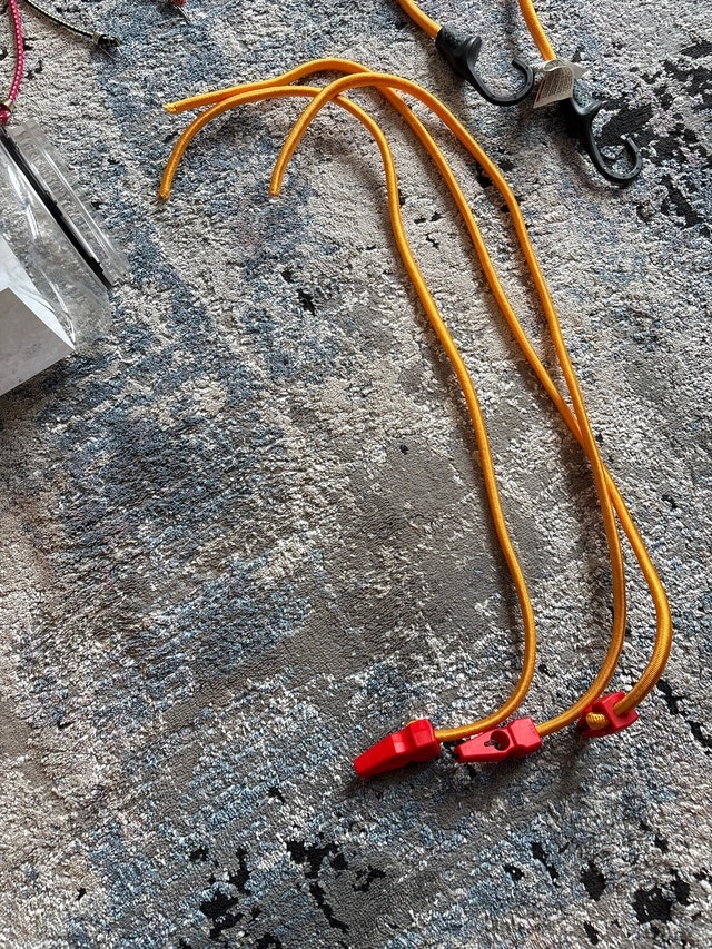 This is a set of 15 assorted HDX bungee cords, perfect for securing items during transport or storage. The set includes a variety of sizes and styles, all in good, used condition. They feature heavy-duty steel hooks with plastic coating, stretchable rubber cords with weather-resistant covers, and easy-grip hooks. Cash accepted.