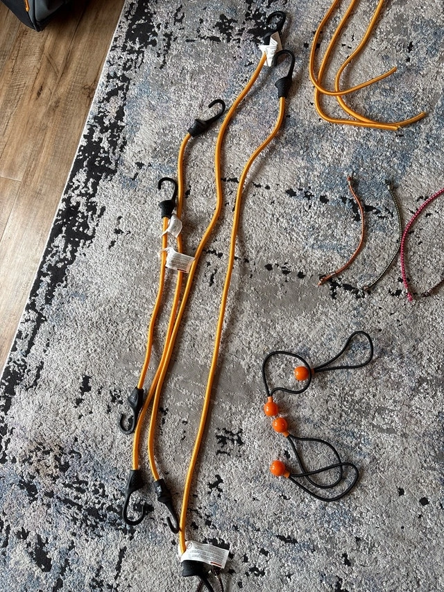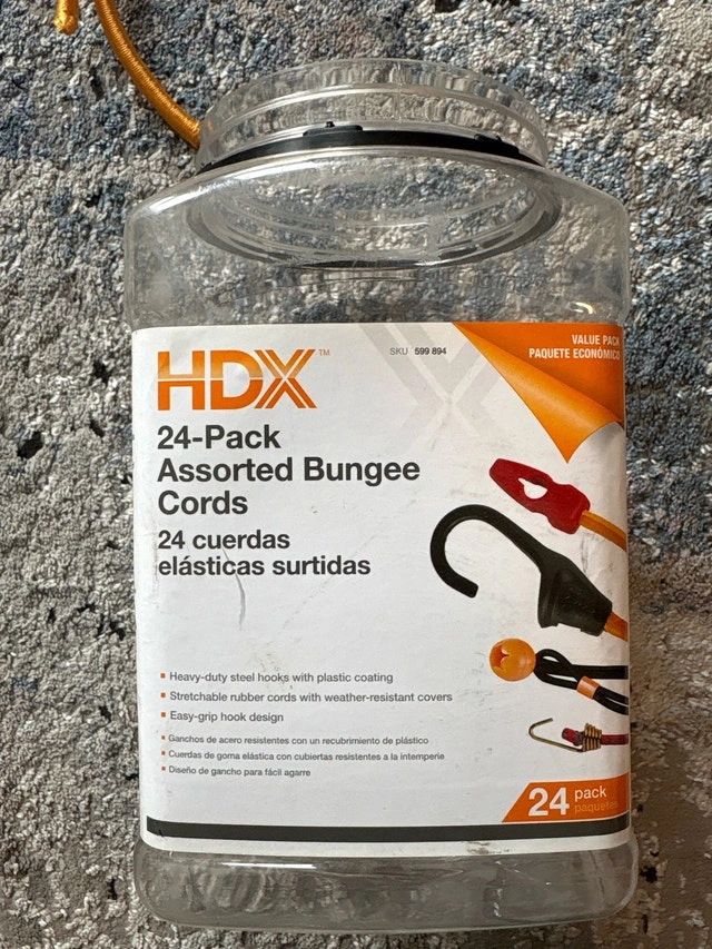 This is a set of 15 assorted HDX bungee cords, perfect for securing items during transport or storage. The set includes a variety of sizes and styles, all in good, used condition. They feature heavy-duty steel hooks with plastic coating, stretchable rubber cords with weather-resistant covers, and easy-grip hooks. Cash accepted.