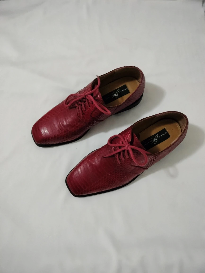 Selling a pair of Giorgio Brutini shoes with a unique red snakeskin pattern. These shoes are eye-catching and stylish, perfect for adding a touch of flair to your wardrobe. They are in great condition and ready for a new owner!
