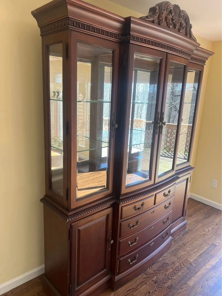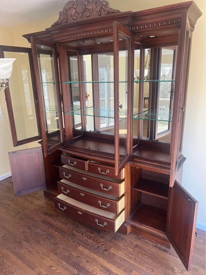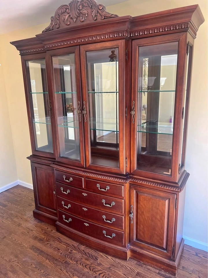 High-quality Thomasville cabinet in great condition. Solid wood with glass doors and shelving—built to last. Dimensions: 71” W × 19” D × 91” H. Features glass display shelves, lower drawers + cabinet storage, and classic carved detail. It's clean and well maintained. Perfect as a display, bar, or storage piece. Asking $400 OBO – need it gone.