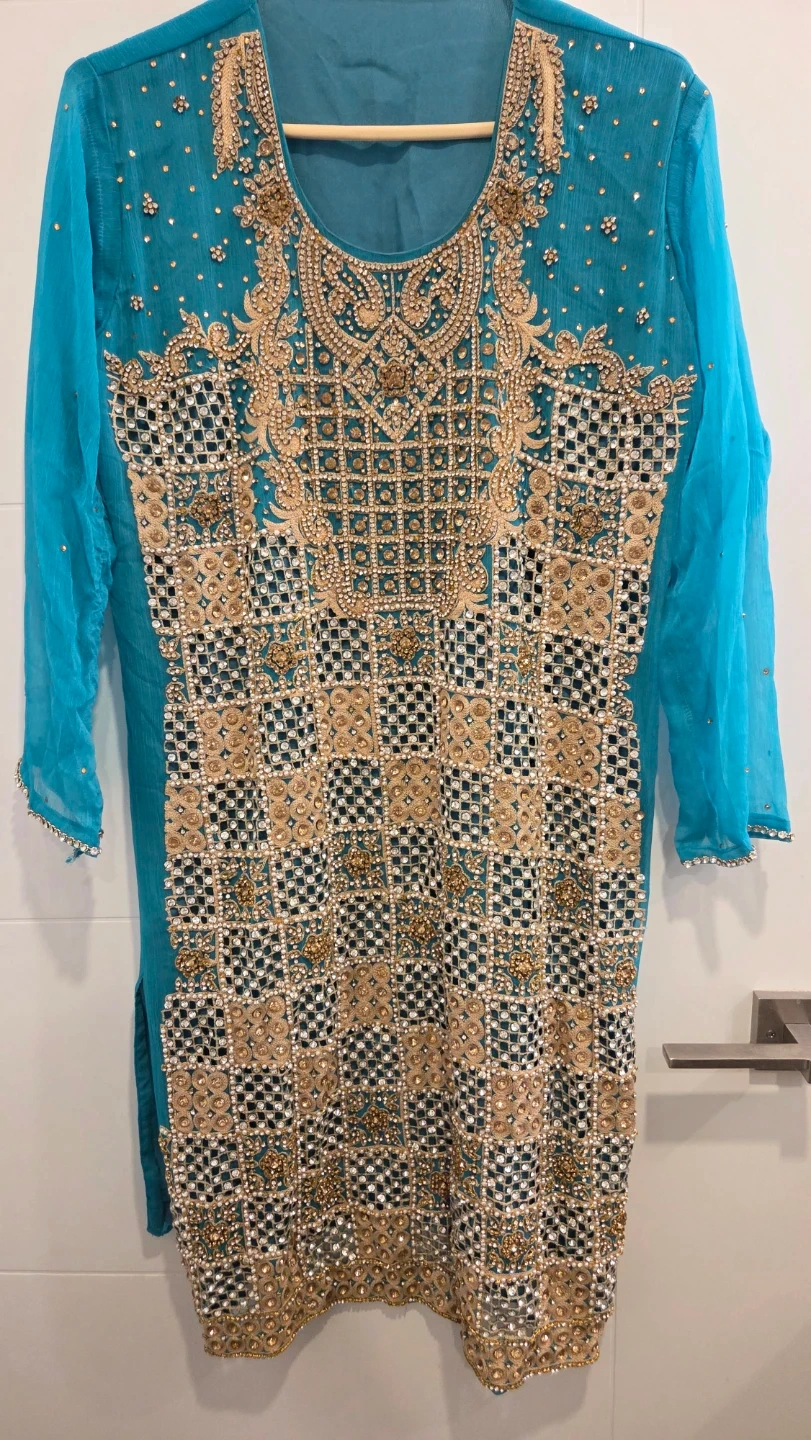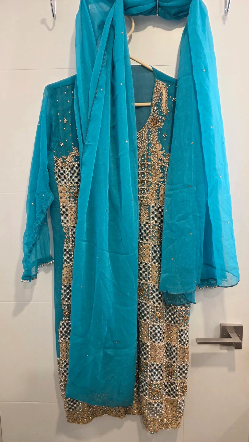 This is a beautiful teal kameez shalwar set with heavy embroidery. It includes a matching dupatta and pants. The fabric is lightweight, perfect for special occasions. It's intricately detailed with beads and sequins.