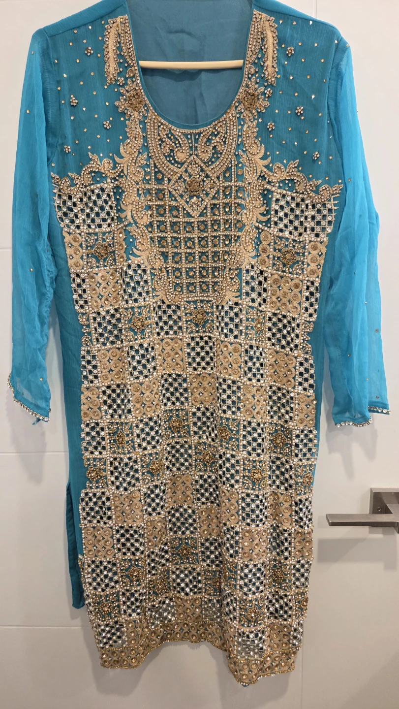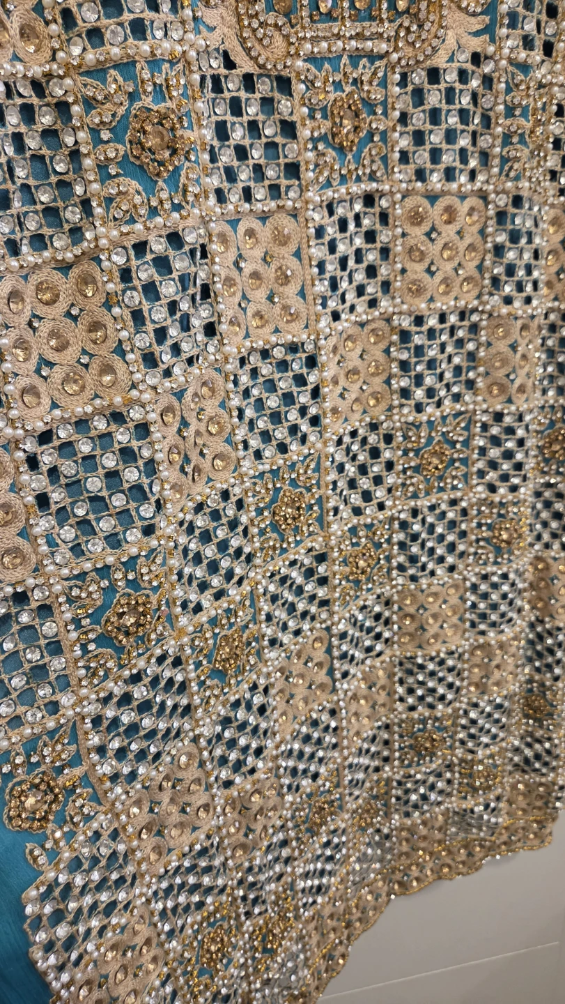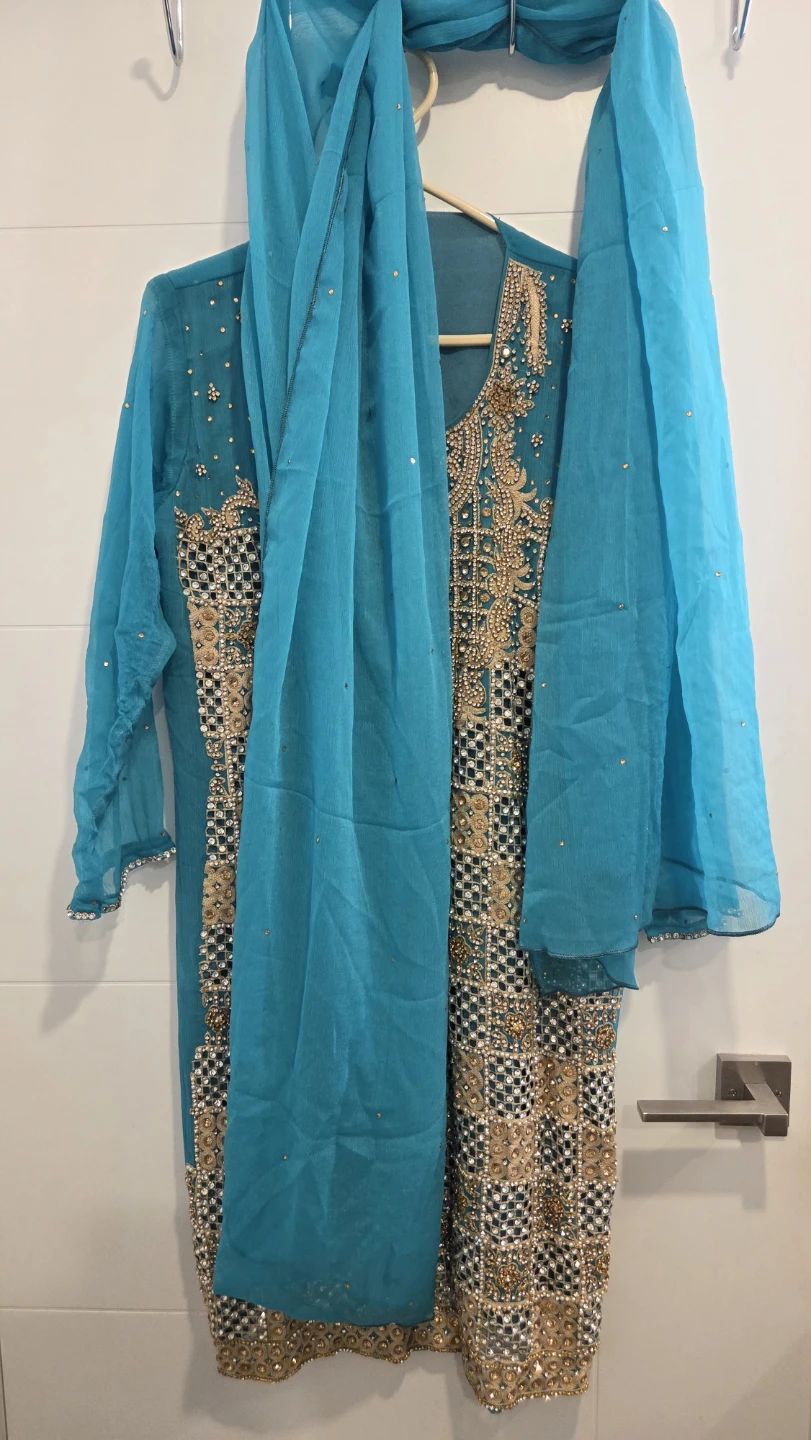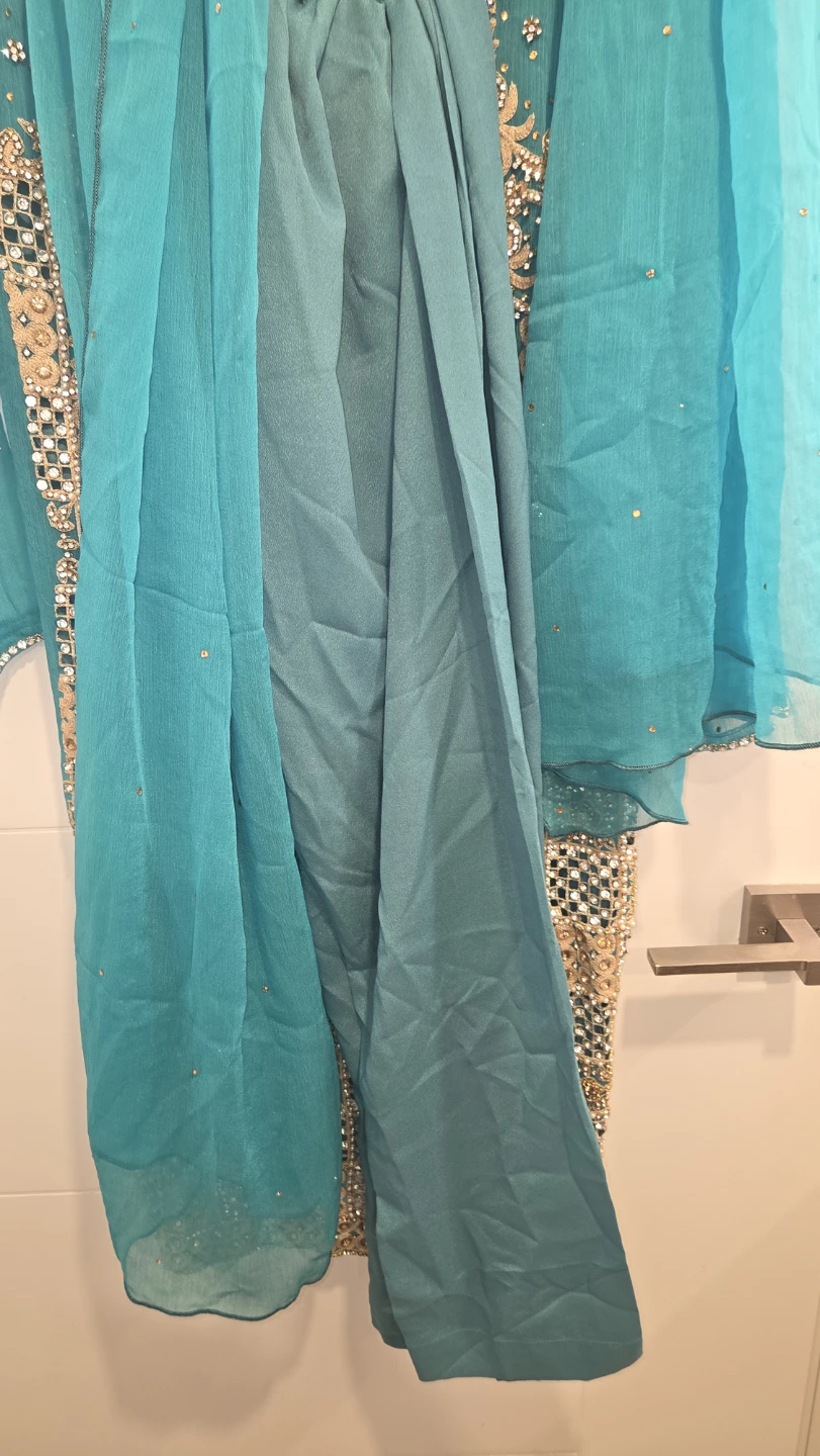 This is a beautiful teal kameez shalwar set with heavy embroidery. It includes a matching dupatta and pants. The fabric is lightweight, perfect for special occasions. It's intricately detailed with beads and sequins.