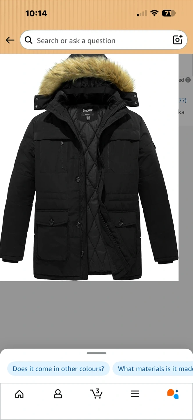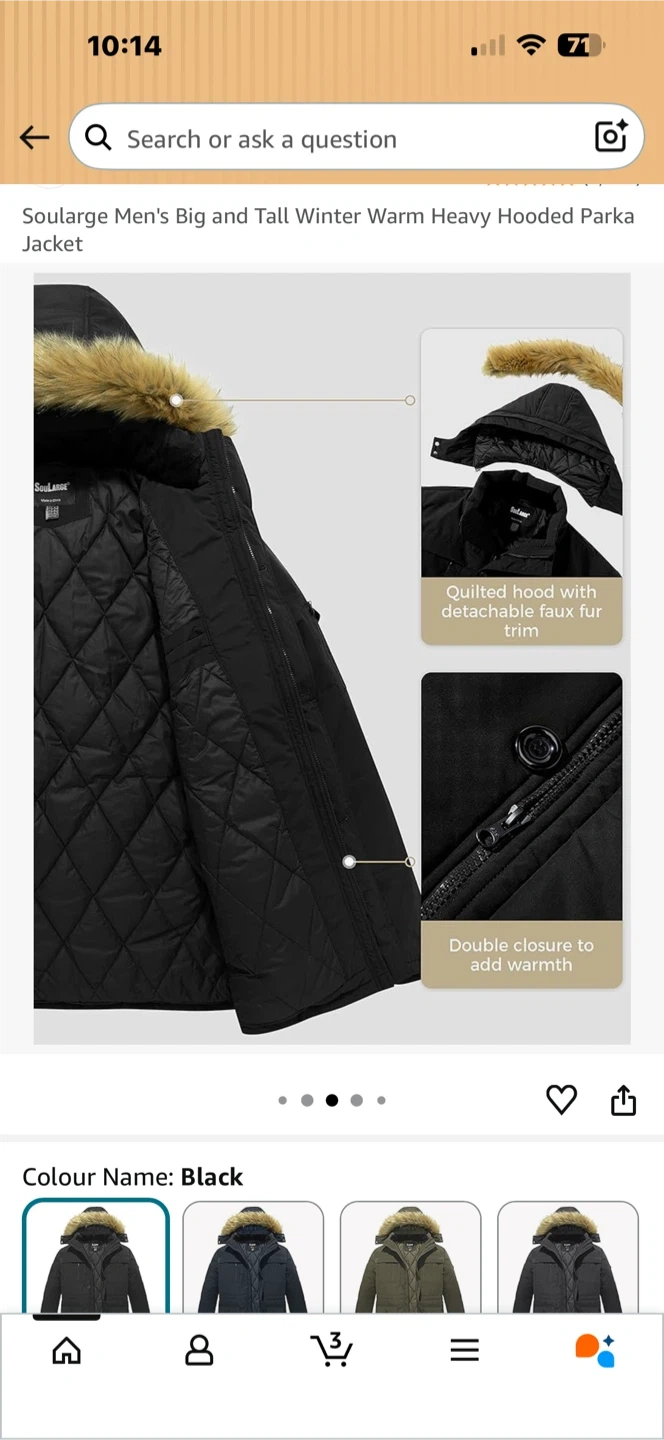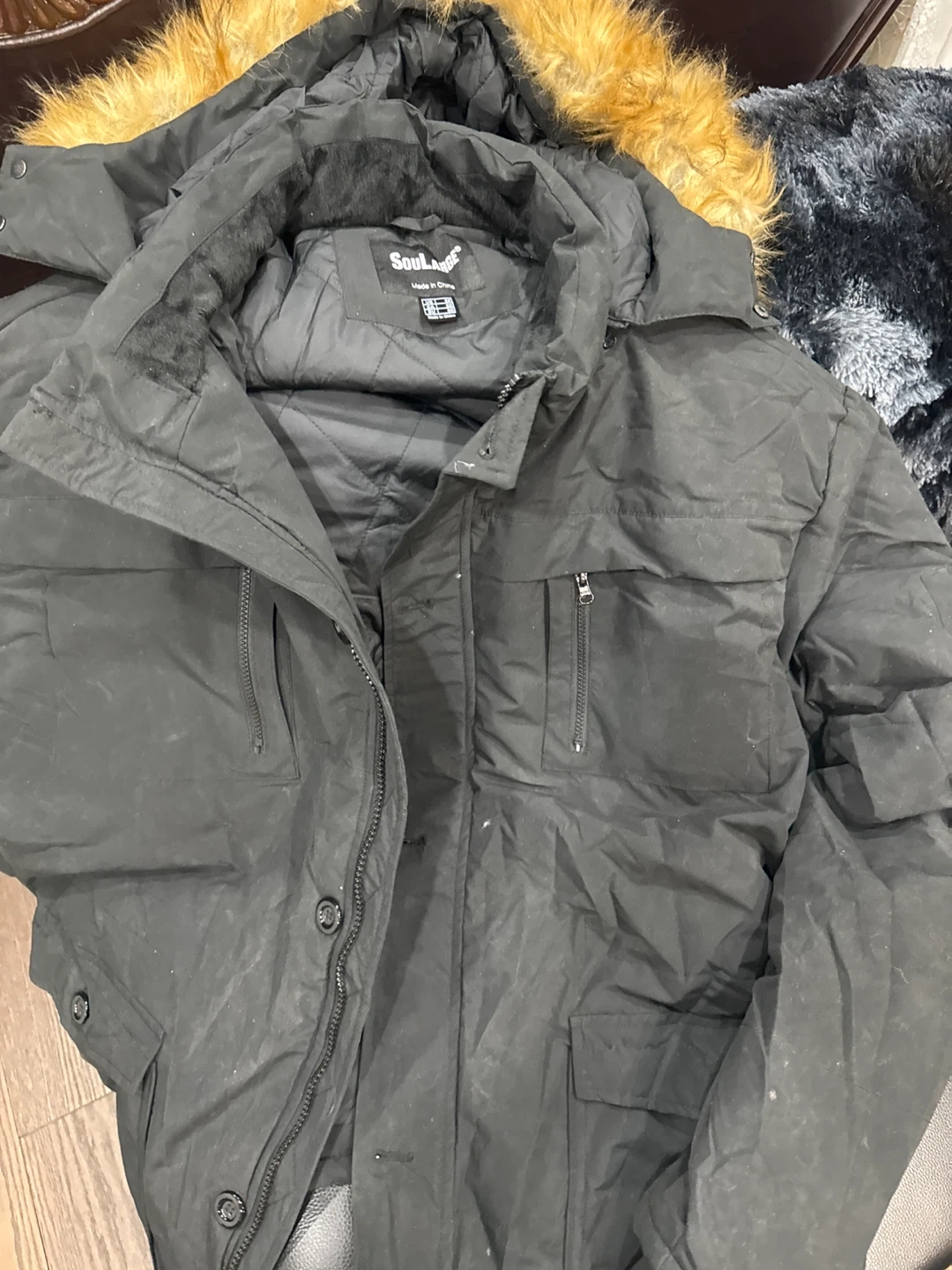 SoulLarge men's black winter parka jacket in size 6X. It features a quilted hood with a detachable faux fur trim and a double closure for added warmth. This parka is designed for cold weather.