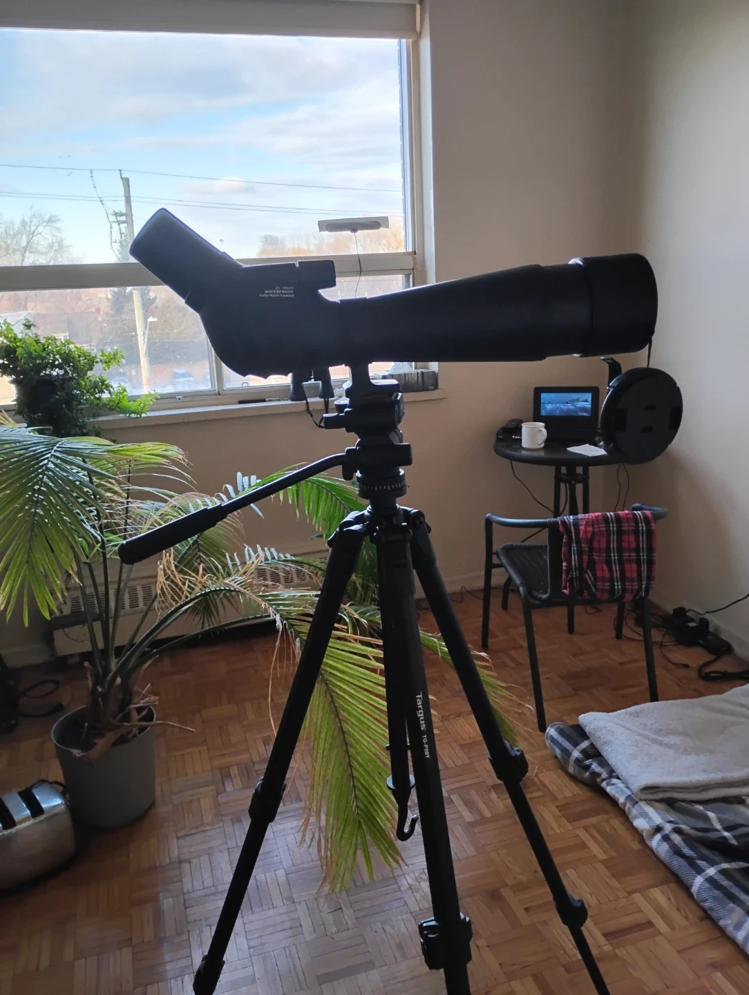 This is a black spotting scope, useful for birdwatching or nature observation. It's mounted on a stable tripod for steady viewing. The scope itself appears to have adjustable magnification. Have receipts paid 288.00 never been outside,no scratches Mint!!!