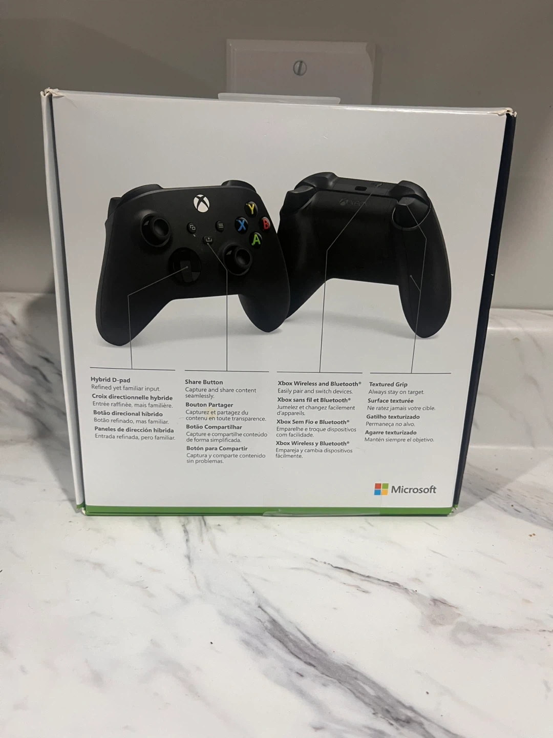 This is an official Xbox Wireless Controller in Carbon Black. It features a hybrid D-pad and textured grip for enhanced control. The controller is compatible with Xbox Wireless and Bluetooth devices. It offers easy pairing and seamless switching between devices.