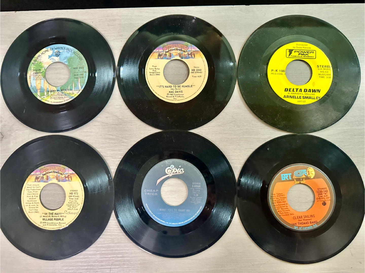 Collection of 15 assorted 7-inch vinyl records. Features artists like Dolly Parton, John Travolta, Olivia Newton-John, and more. These are standard 45 RPM records.will not sell separately must take all