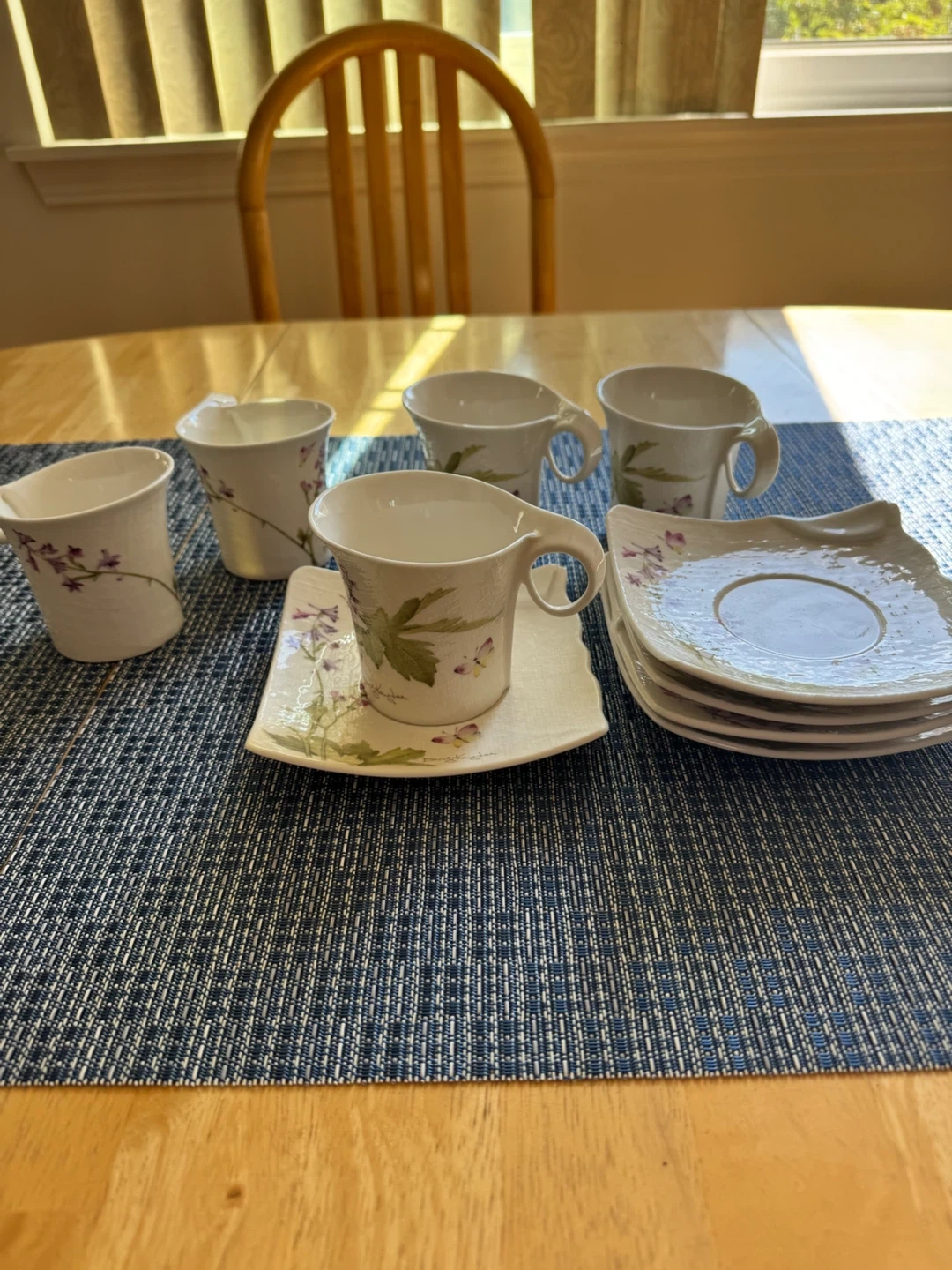 Selling a bone china porcelain cup and saucer set! The set features a delicate floral design on a creamy white background. Perfect for adding a touch of elegance to your tea or coffee time