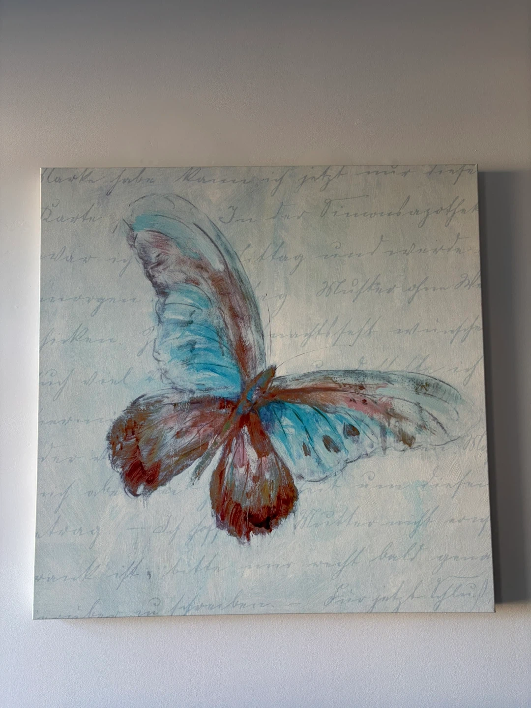 Decorative canvas with a butterfly design in blue tones. The background has handwritten-style text, giving it a modern look.