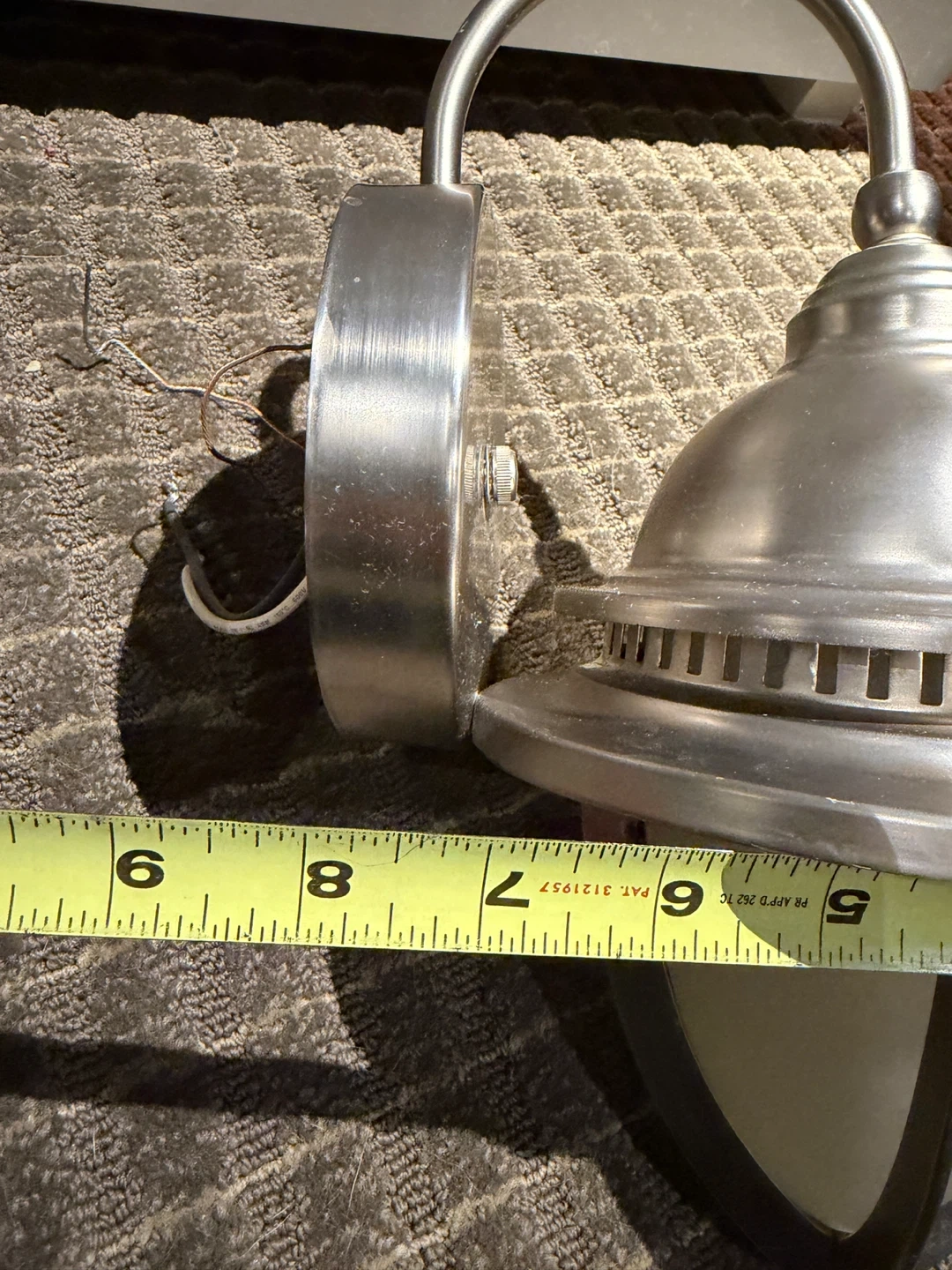 This is a Canarm Harbor Breeze wall mount light fixture. It features a brushed nickel finish and frosted glass. The fixture measures approximately 12 inches in height and 7 inches in diameter (5 inches from center of mount to the top). It's suitable for outdoor installation.