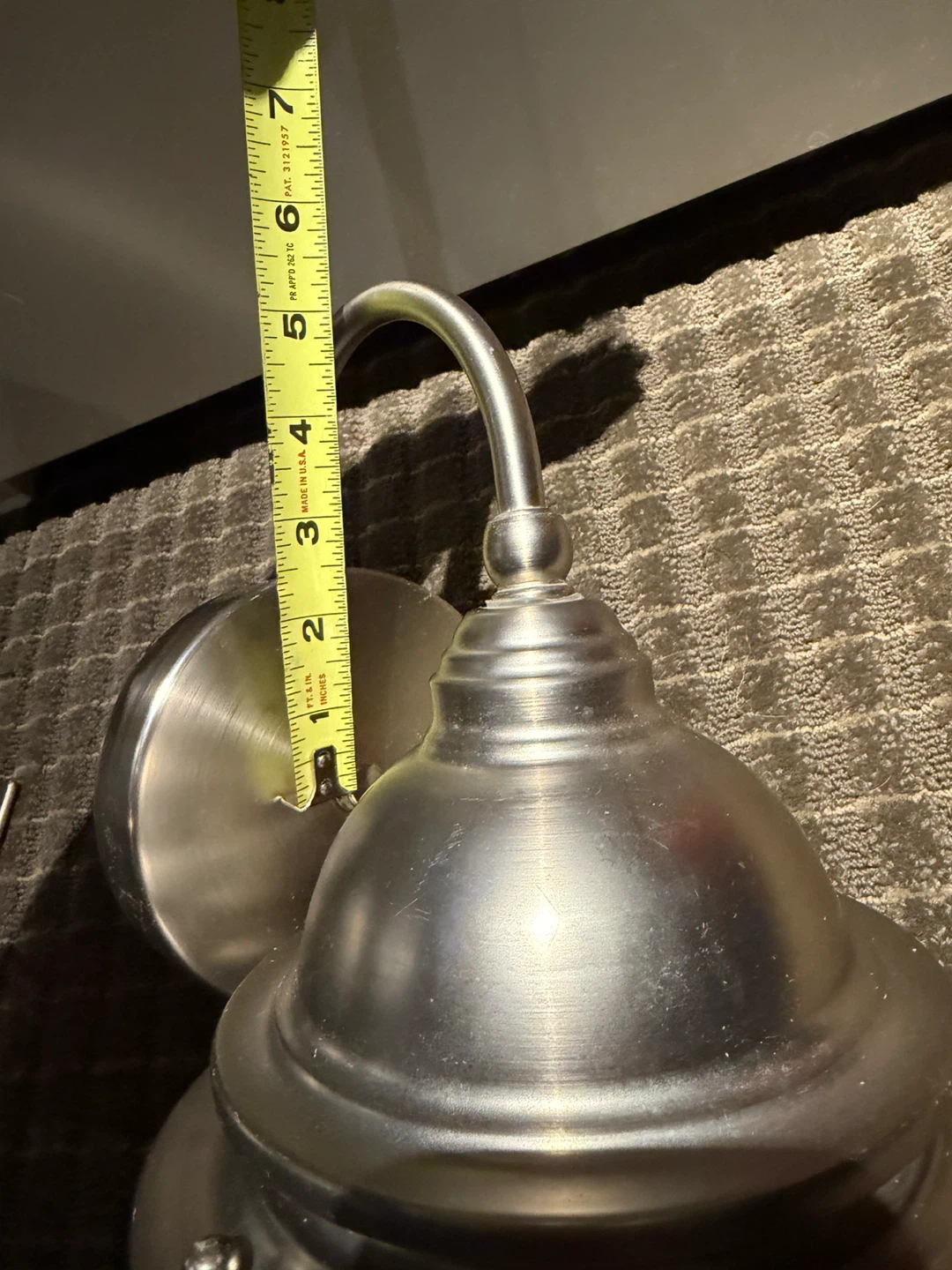 This is a Canarm Harbor Breeze wall mount light fixture. It features a brushed nickel finish and frosted glass. The fixture measures approximately 12 inches in height and 7 inches in diameter (5 inches from center of mount to the top). It's suitable for outdoor installation.