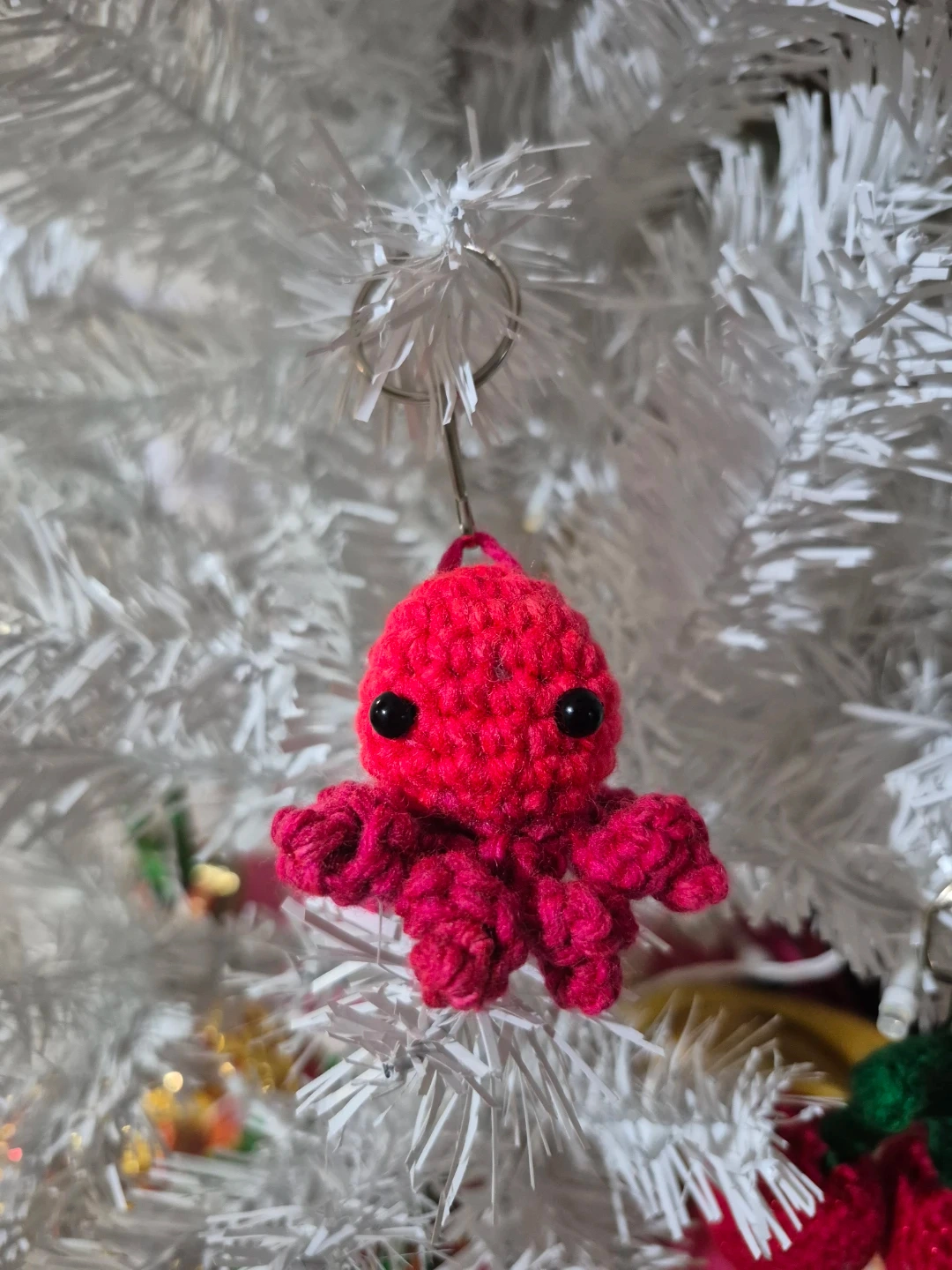 Handmade crocheted octopus keychain in a bright pink colour. It has black bead eyes and a metal keyring attachment. Perfect for adding a little charm to your keys or bag!