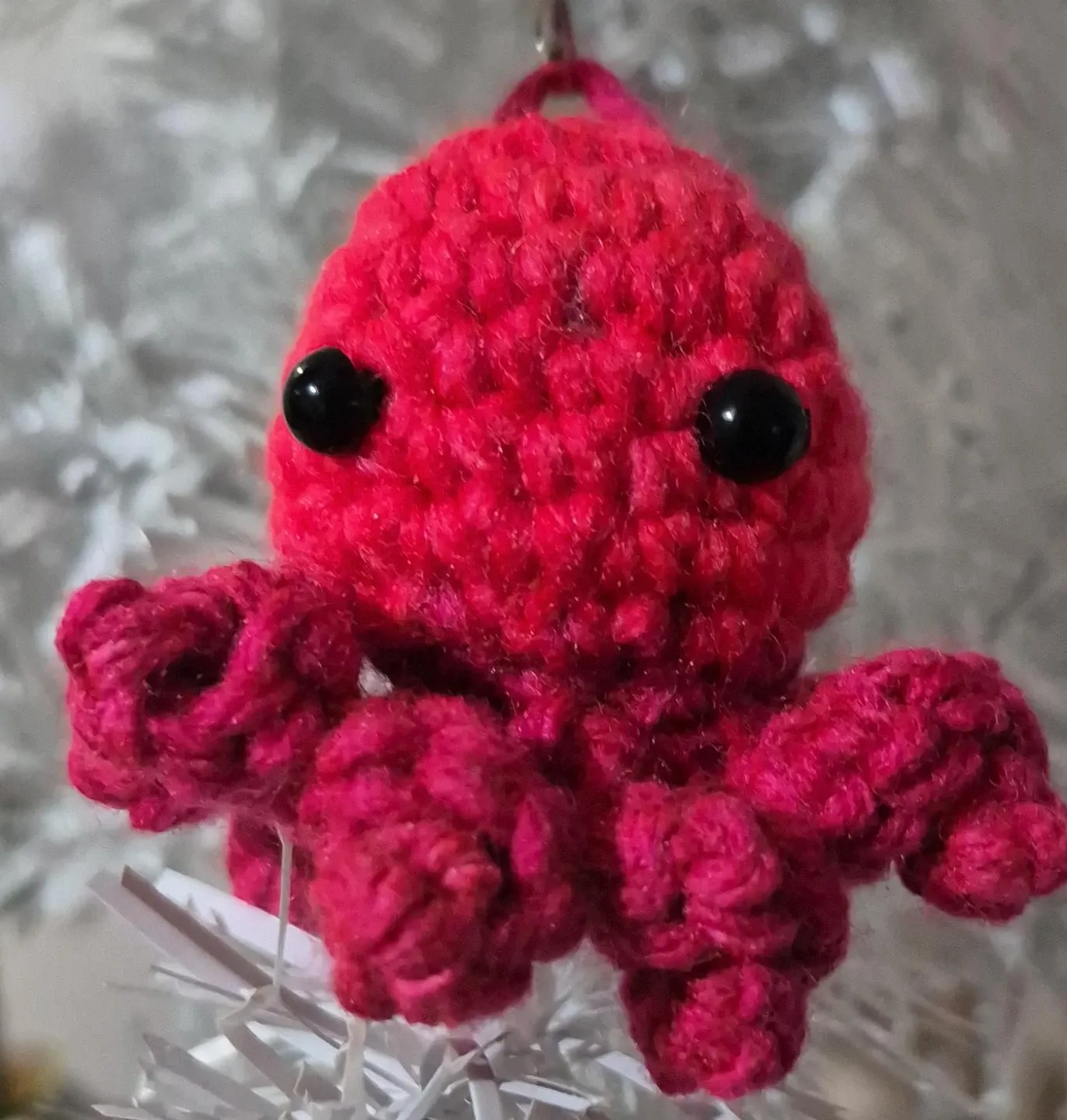 Handmade crocheted octopus keychain in a bright pink colour. It has black bead eyes and a metal keyring attachment. Perfect for adding a little charm to your keys or bag!