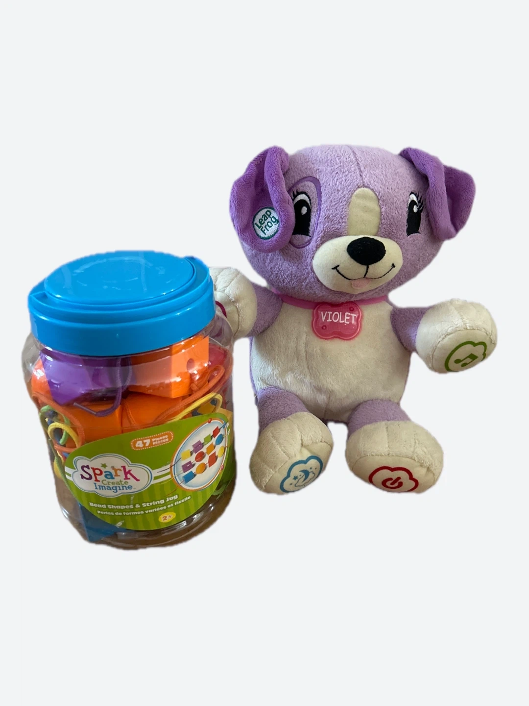 This Spark Create Imagine jug includes 47 pieces of beads and string for crafting. It's recommended for ages 2 and up. Kids can create necklaces or other designs! With leap frog music making stuffy “ my pal violet “ take one for 5 or both for 8