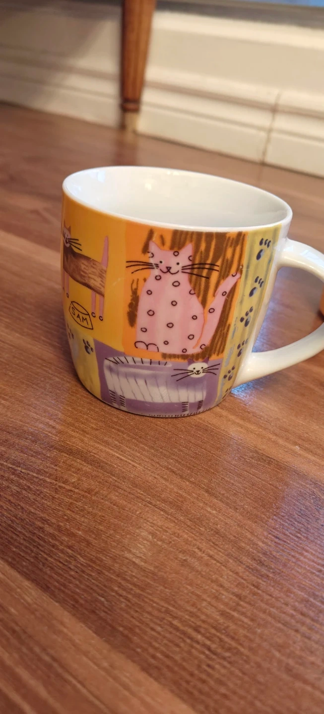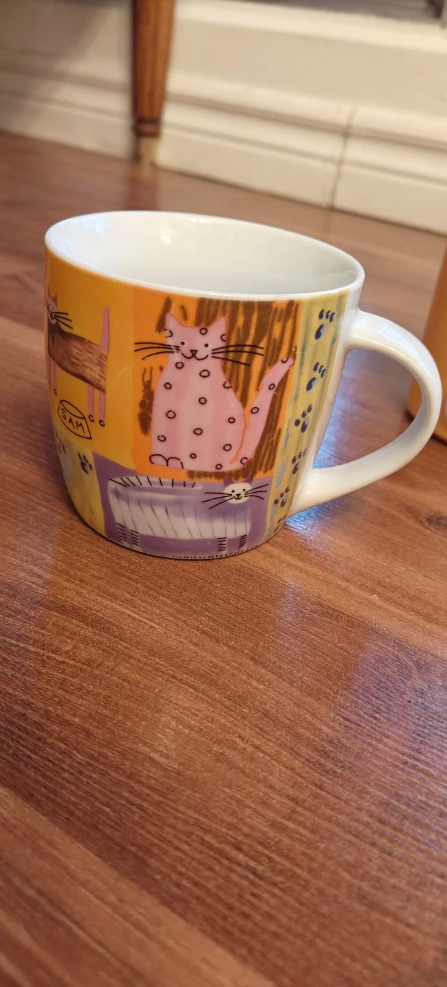 Selling a couple of cute novelty mugs. One is a yellow mug with a balloon dog handle. The other is a cat-themed mug with lots of different cats on it