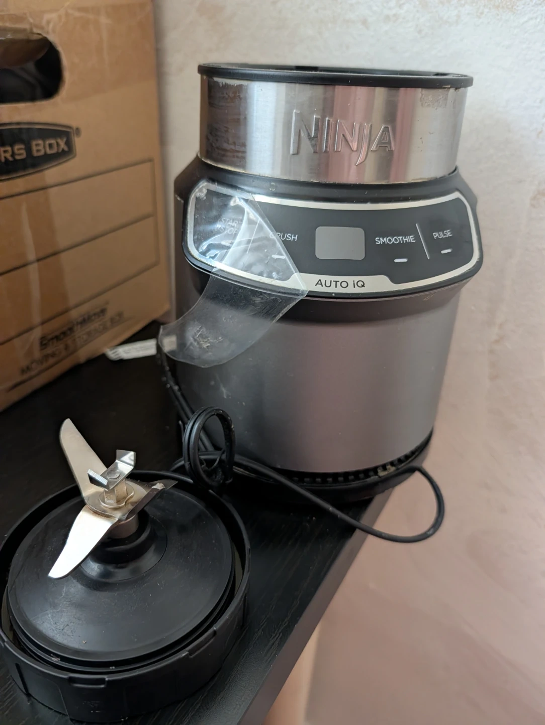 This Ninja blender features Auto-IQ technology for smart blending programs. It has settings for crush, smoothie, and pulse. The unit comes with a blade assembly and a blending cup.
