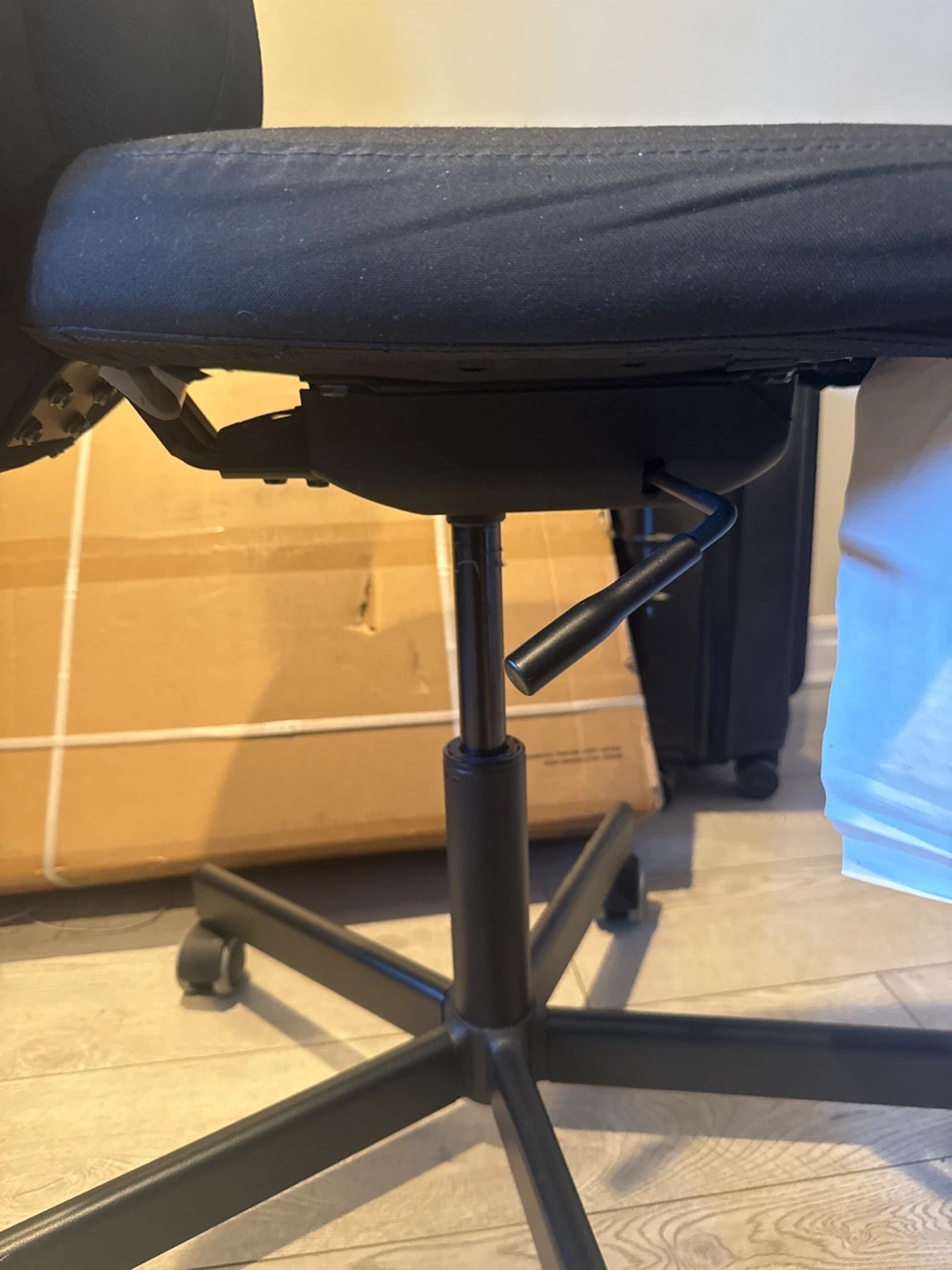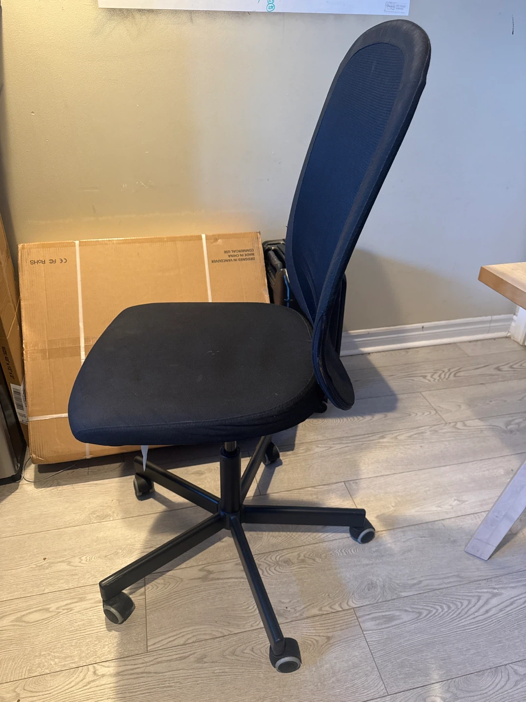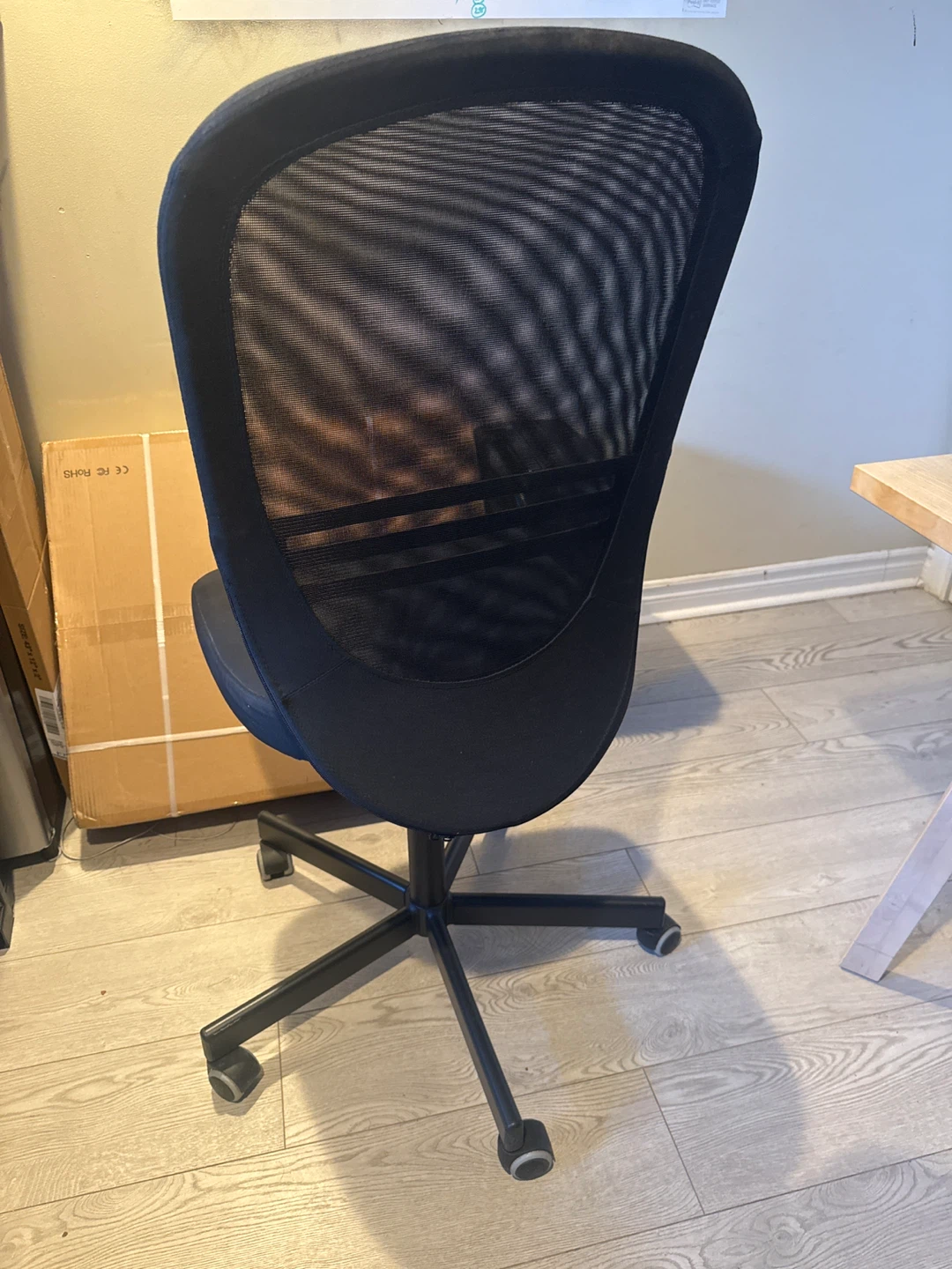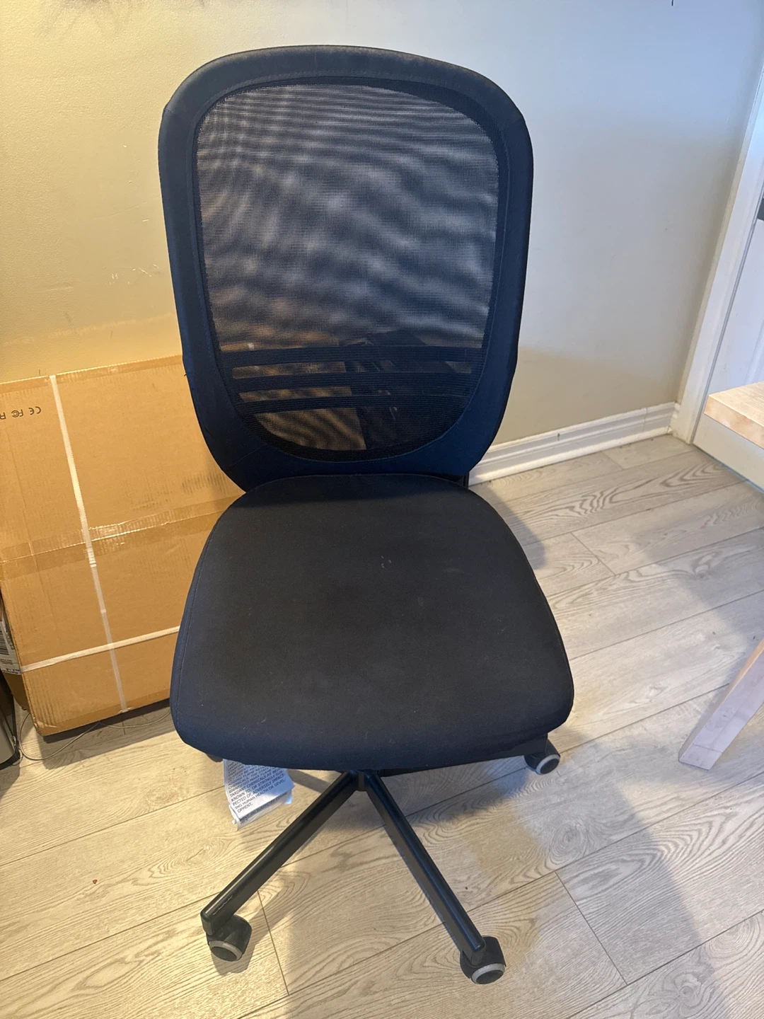 This black office chair features a breathable mesh back and a padded seat. It's on casters for easy movement. The height is adjustable using the lever. Great for your home office!